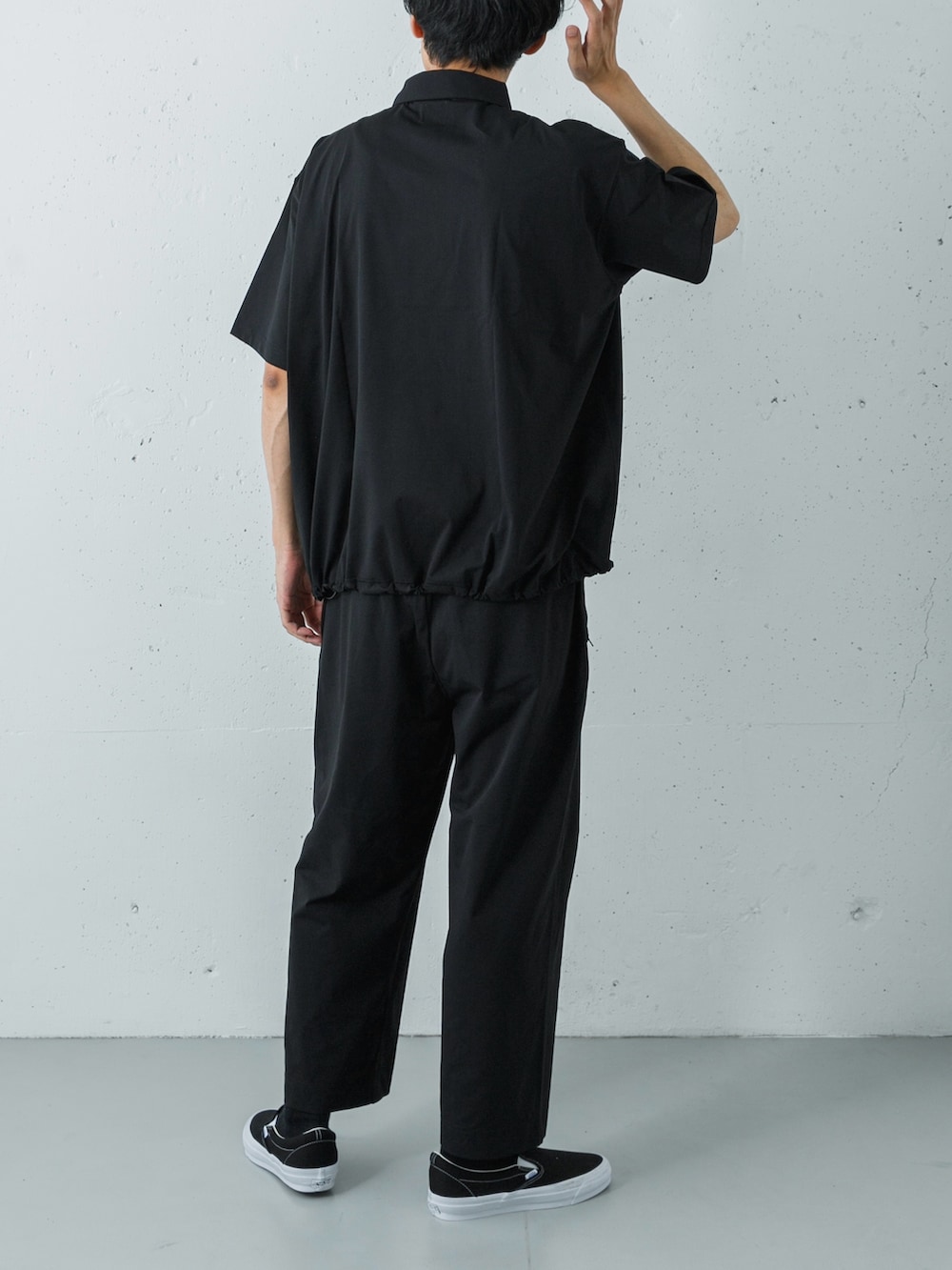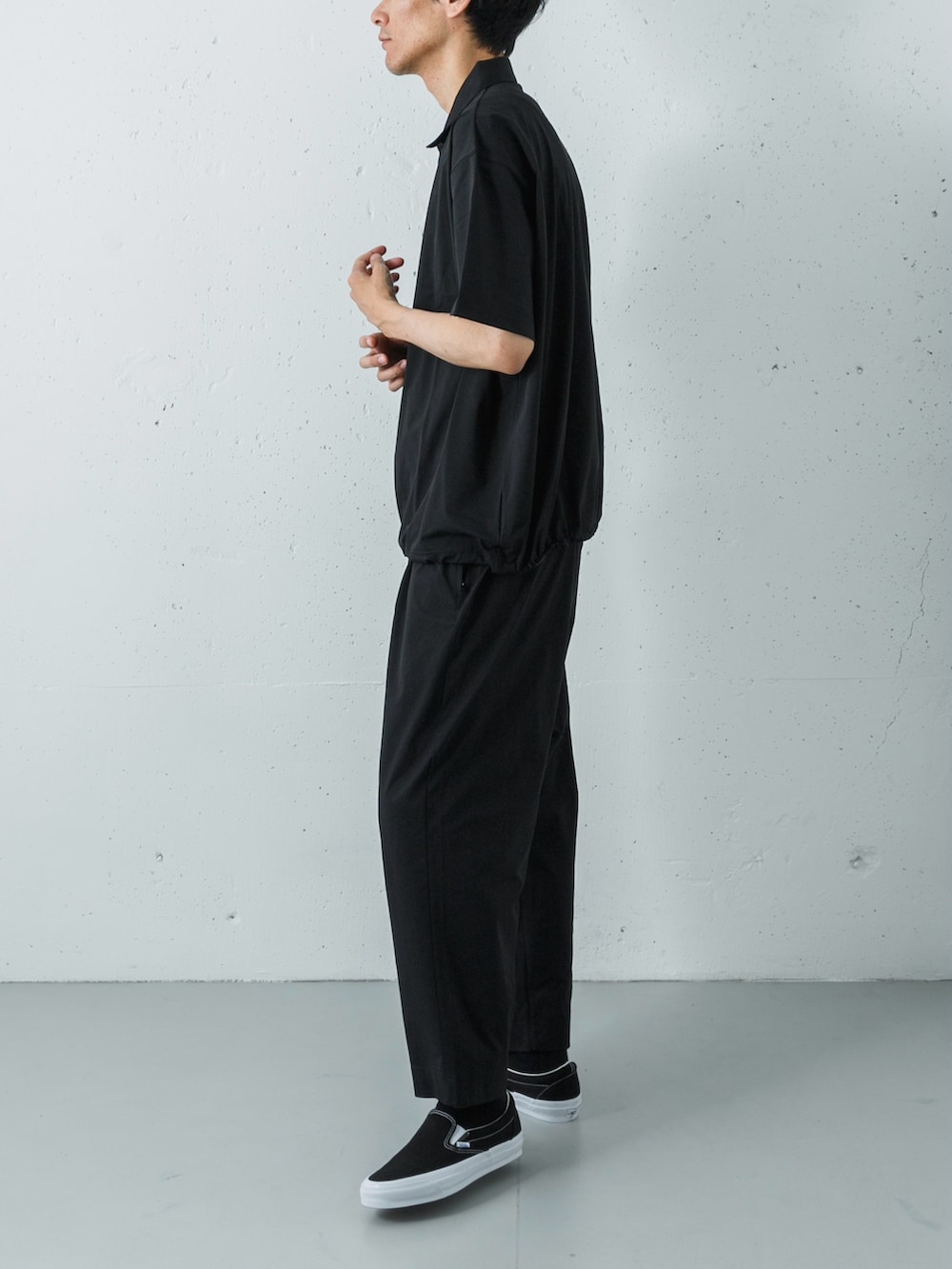 最大の特徴は、その名の通り「そよ風(BREEZY)」のような圧倒的な通気性と軽やかさ。機能的なテック素材をゆとりあるワイドシルエットで仕立てることで、全身を深いネイビーで統一しながらも、重苦しさを感じさせない都会的でモードな空気感を纏っています。