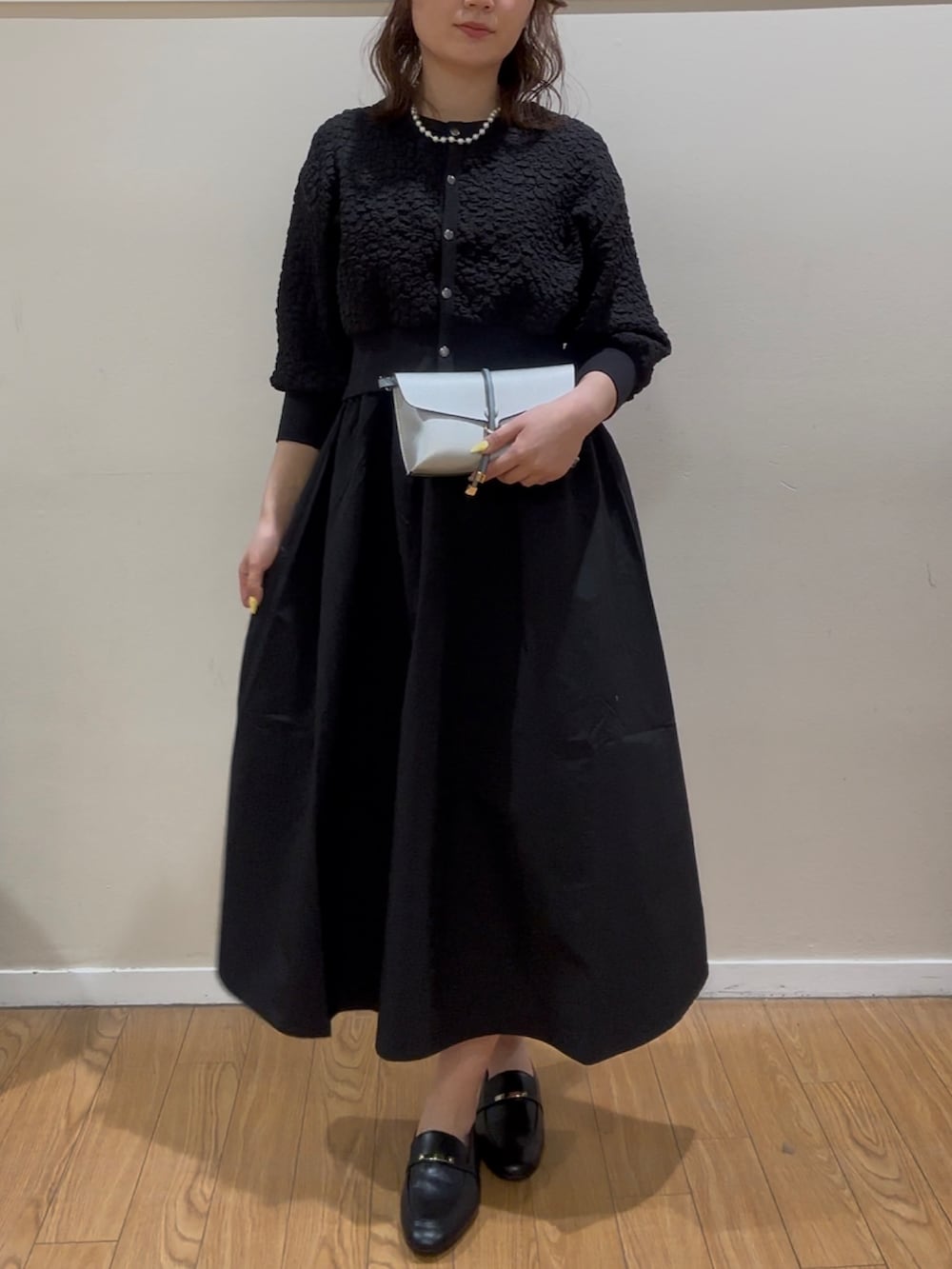 ブラックで統一することで甘さを抑えつつ、シルエットの美しさを引き立てた大人スタイルに仕上げました。