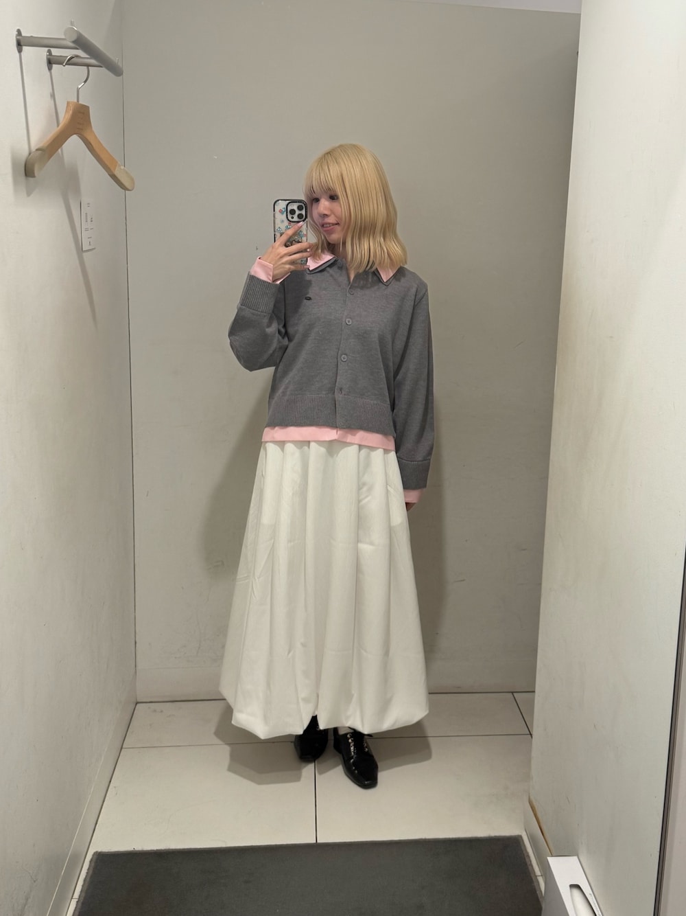 淡いブルーのジャケットを主役に、白×グレーでまとめた抜け感コーデ。