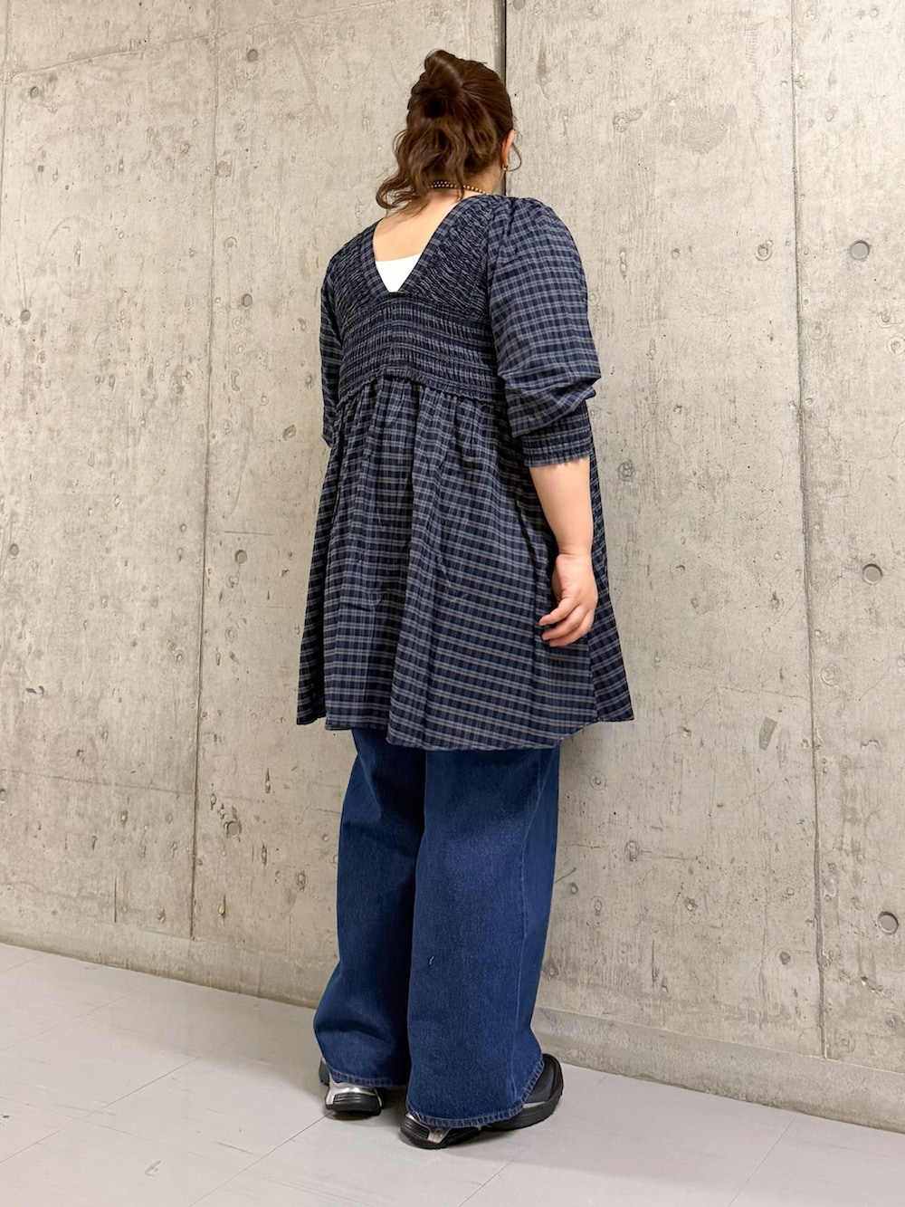 ワンピースは細かいチェックなので合わせやすく、サイズ感も着やすくて◎