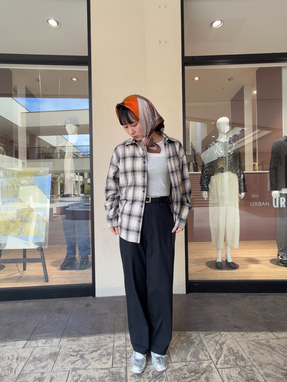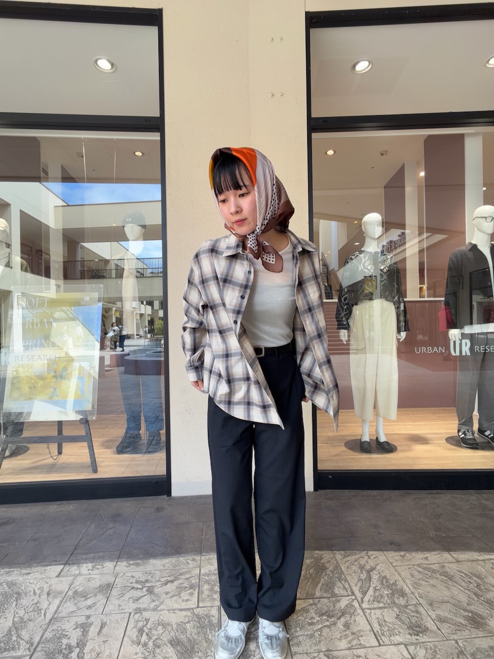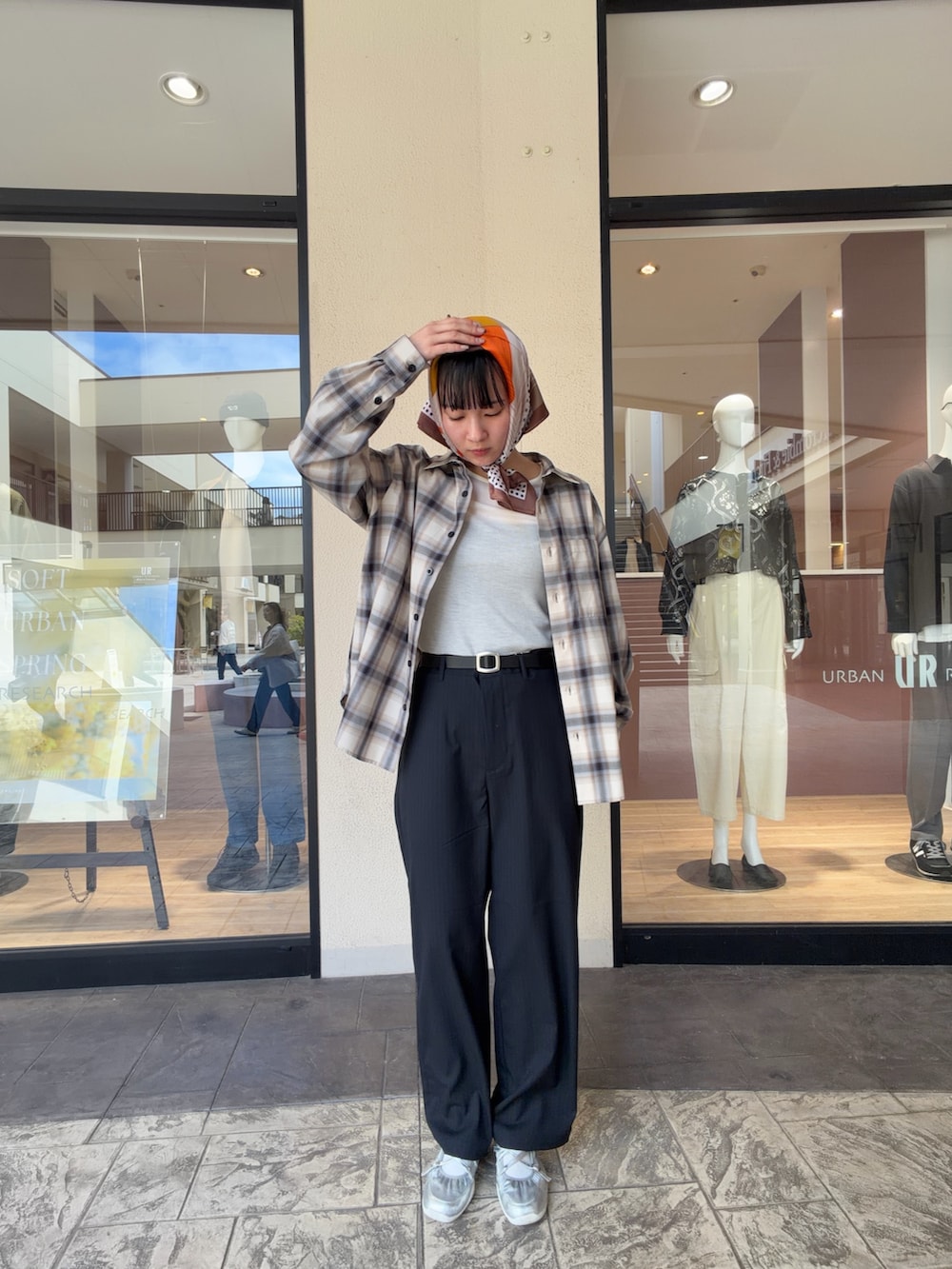 チェックシャツとスラックスで落ち着いた印象にまとめつつ、スカーフをアクセントにしてスタイリングに動きを出しました。あえてラフに羽織ることで抜け感をつくり、かっちりしすぎないバランスにしています。シンプルな中に少しの遊びを加えたコーデです。