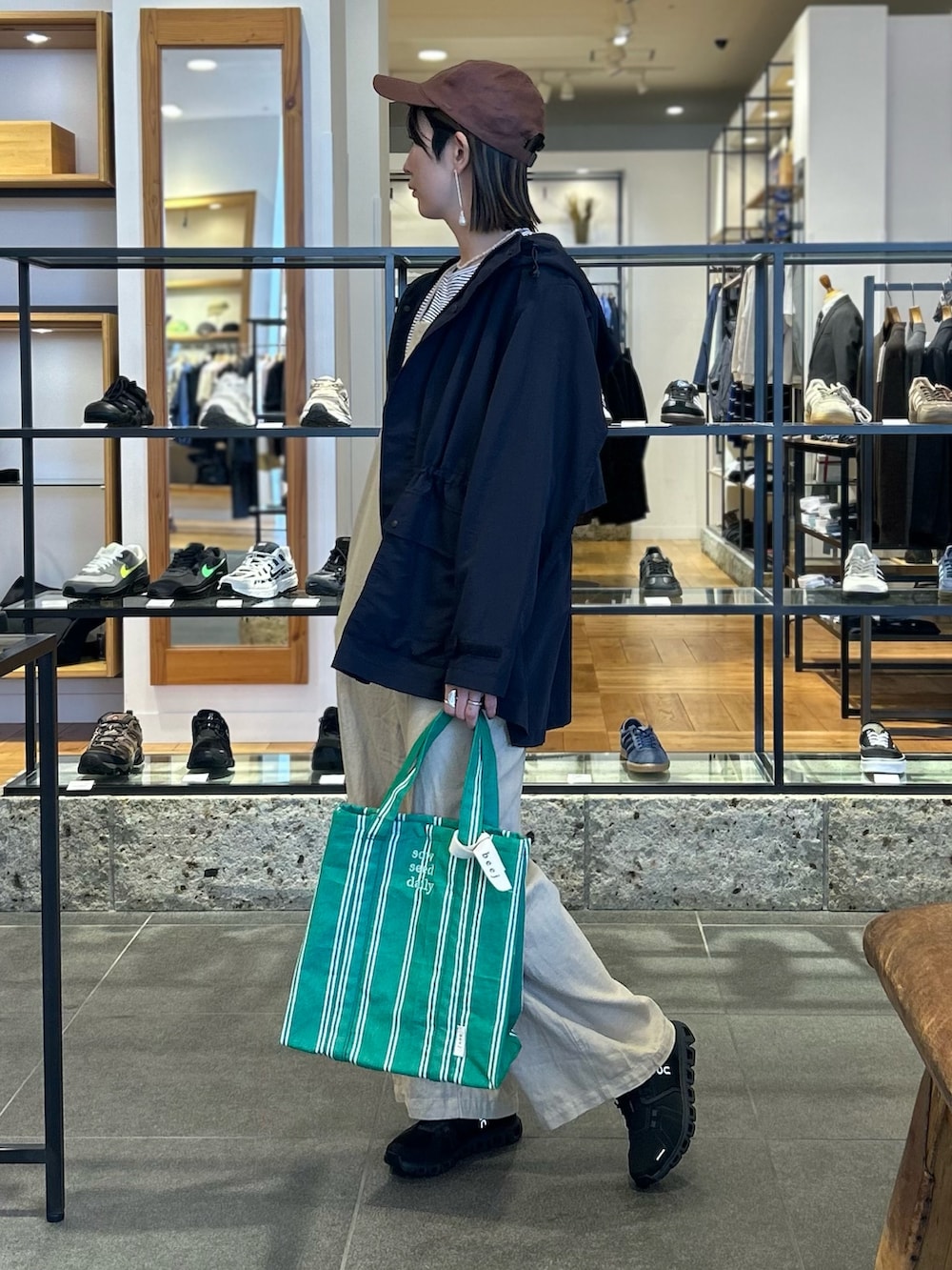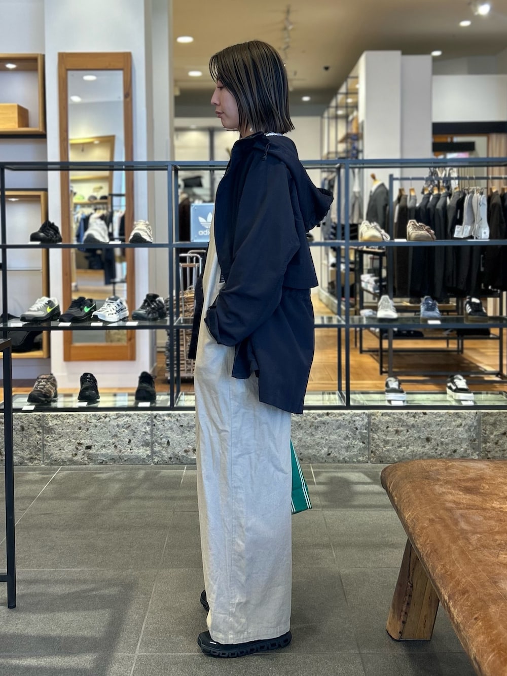 アウターはゆったりとしたシルエットながら、ウエスト調節ができるので体型カバーができて