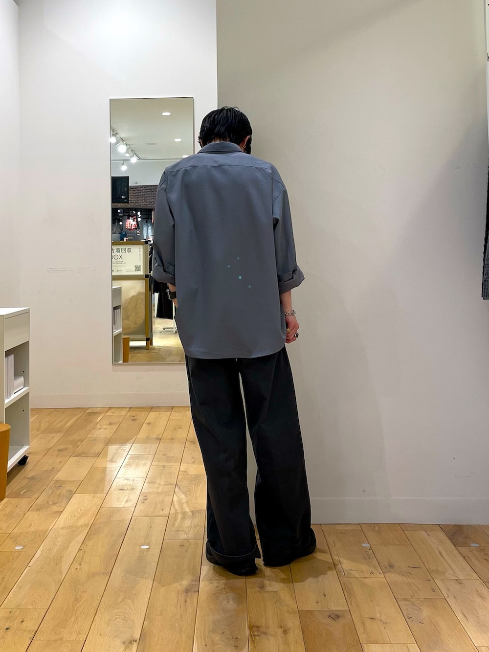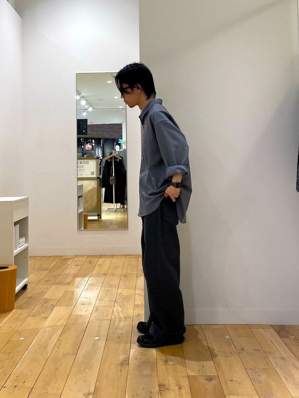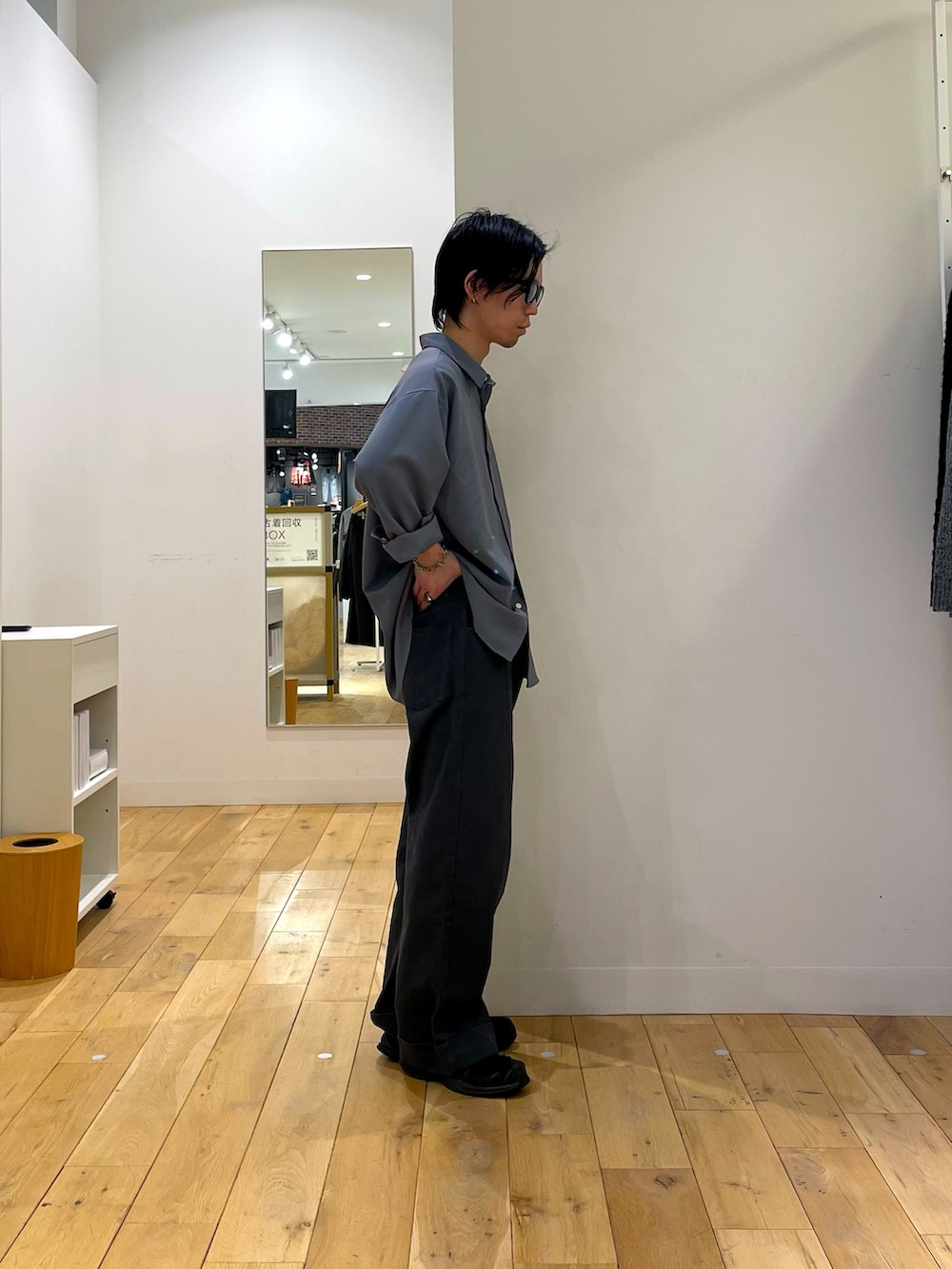 表情の面白い生地のシャツに、カジュアルパンツには珍しいダブル仕様のカツラギパンツ。仔細に富んだアイテムたちです。
