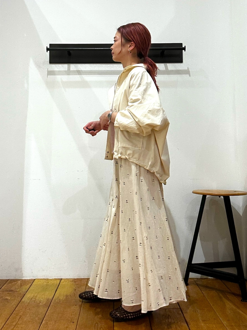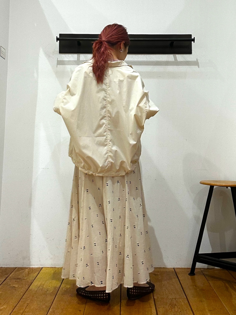 カジュアルさを抑えつつなスタンドブルゾンに、控えめピンクが可愛い少しラメ感のあるトップスをin!