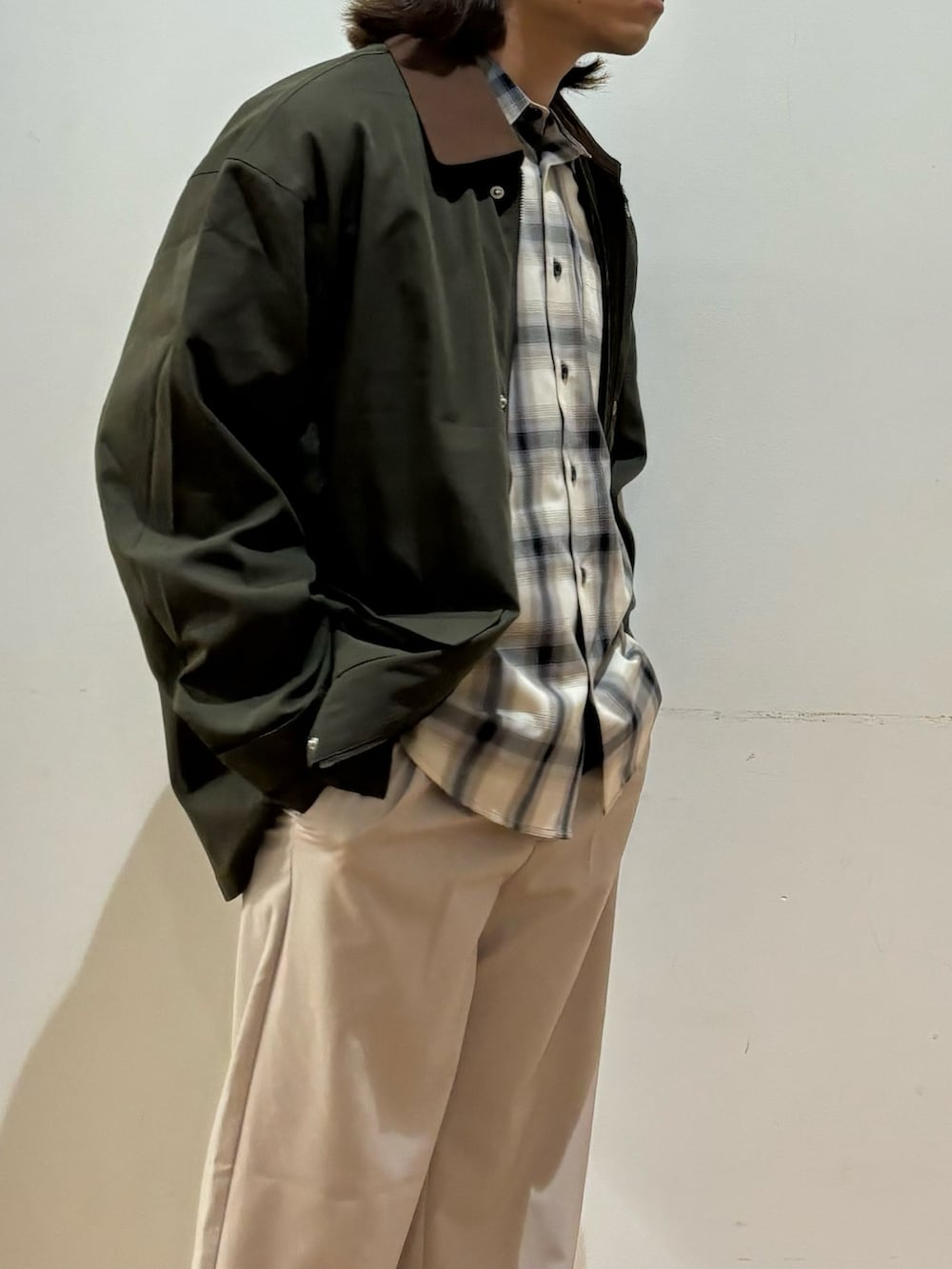 インナーのオンブレチェックシャツは使いやすい配色とさらっとした生地感が特徴的です!