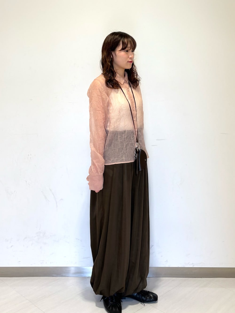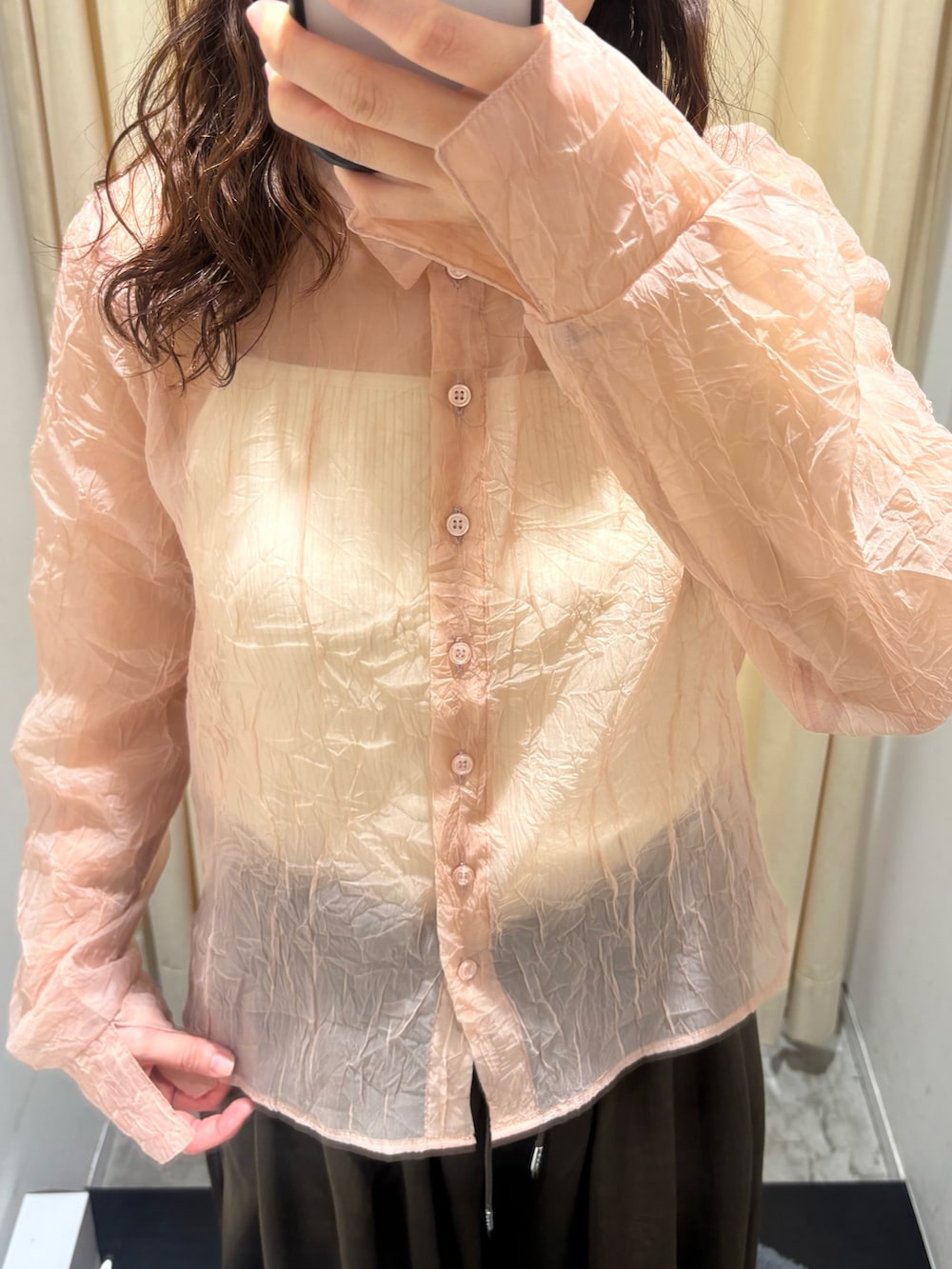程よいシアー感が、一気に女性らしい印象にしてくれます!表面に少し、ワッシャー加工(シワ感)があるので、シワも気にしなくて大丈夫なのが、おすすめです!