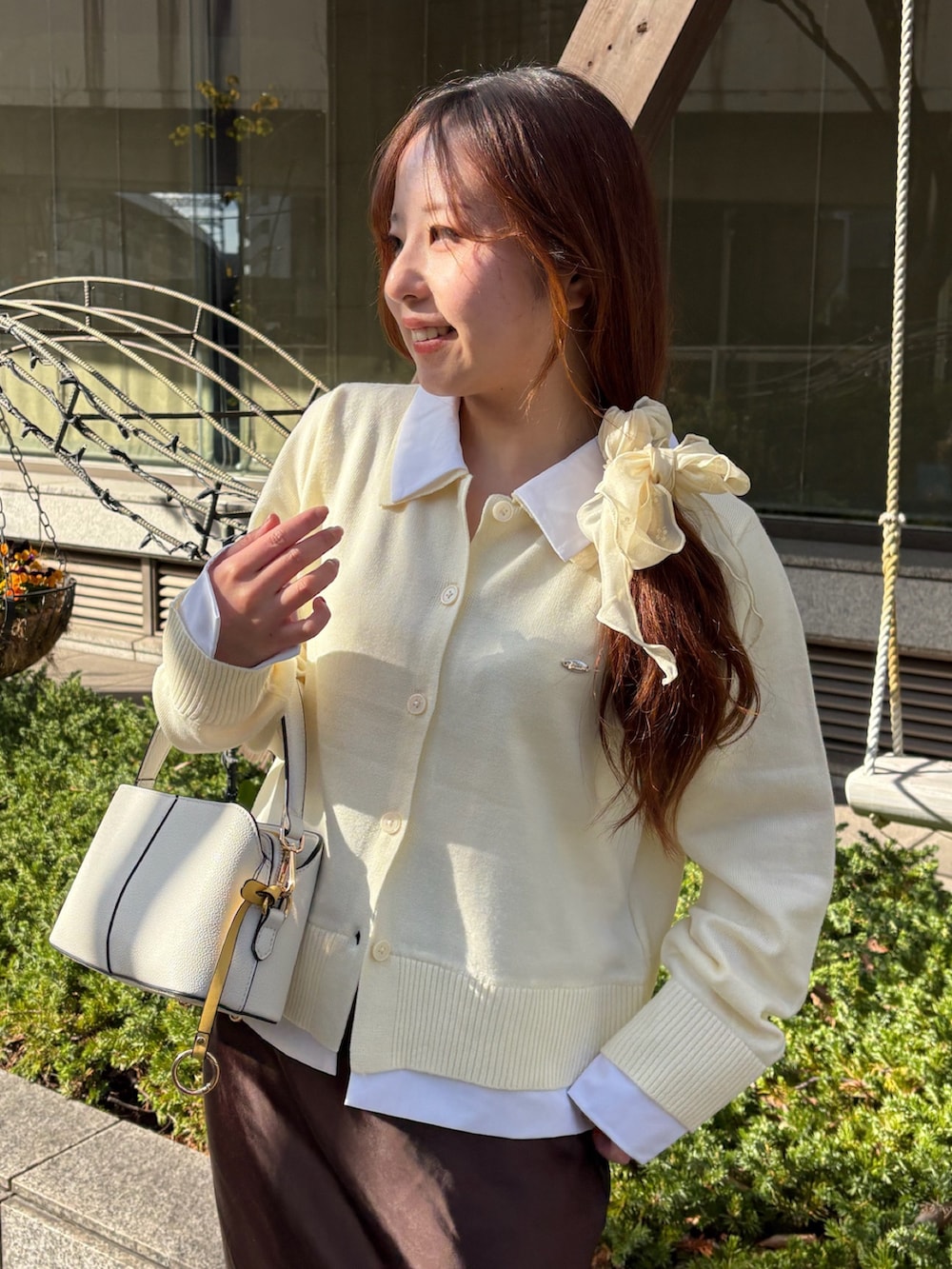 こちらのカーディガンはシャツをレイヤードしたようなドッキングデザインと胸元のプレートがワンポイントになっていて、幅広いシーンで着ていただける1着になっております🤍