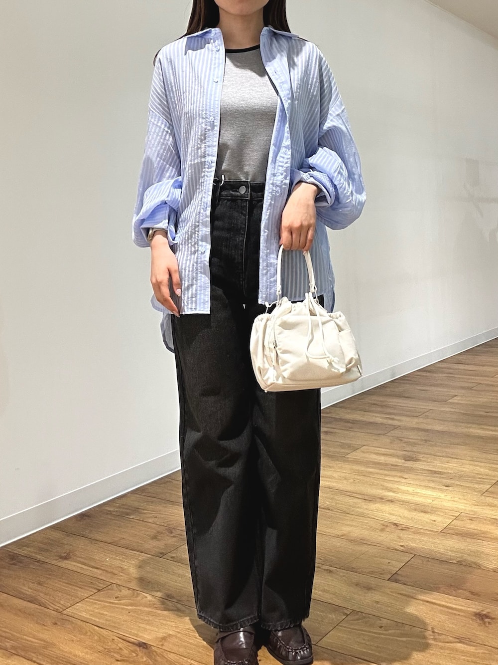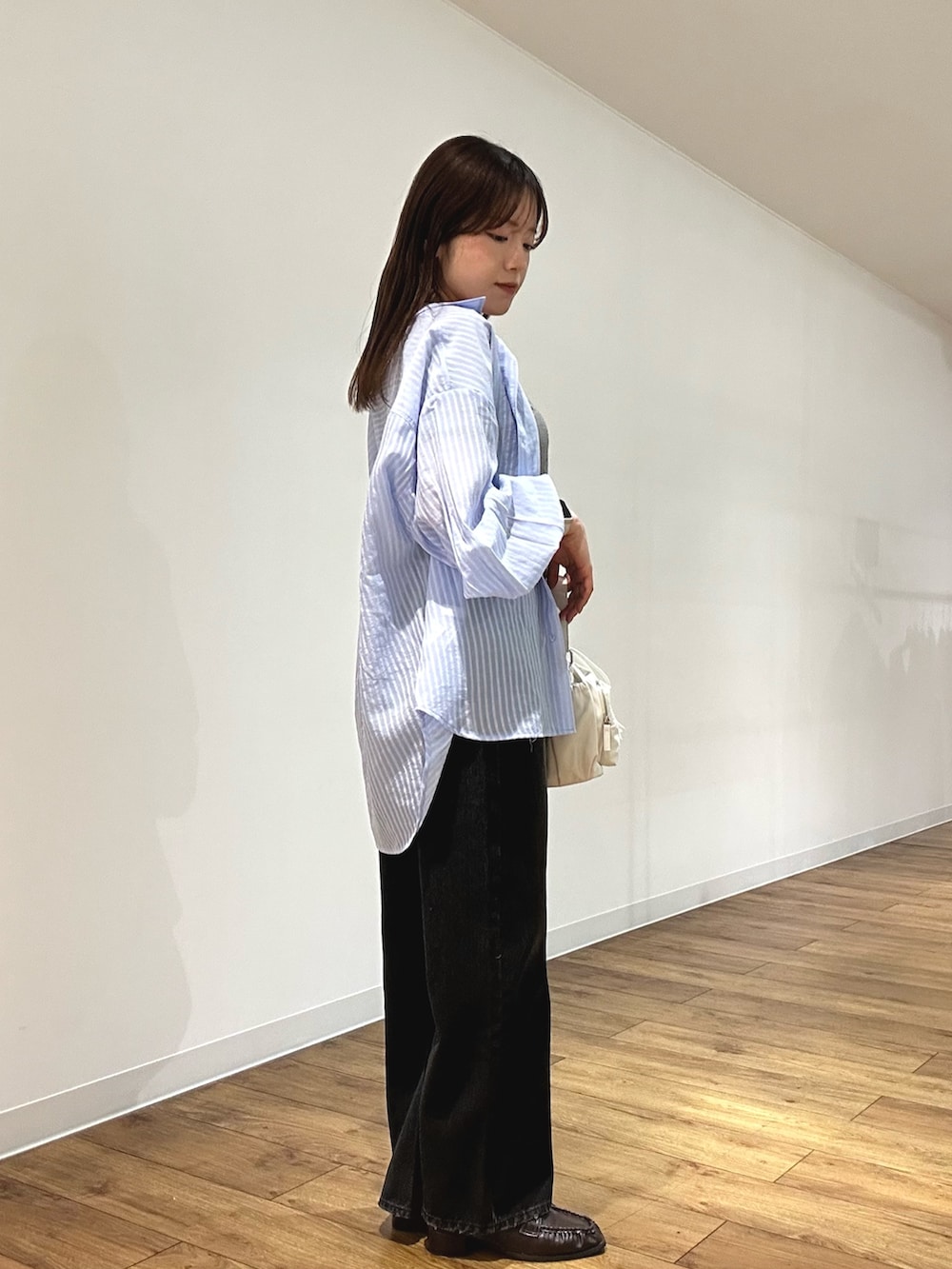 定番のストライプシャツは、シワになりにくい柔らかい素材で1枚持ってると万能なアイテムです!