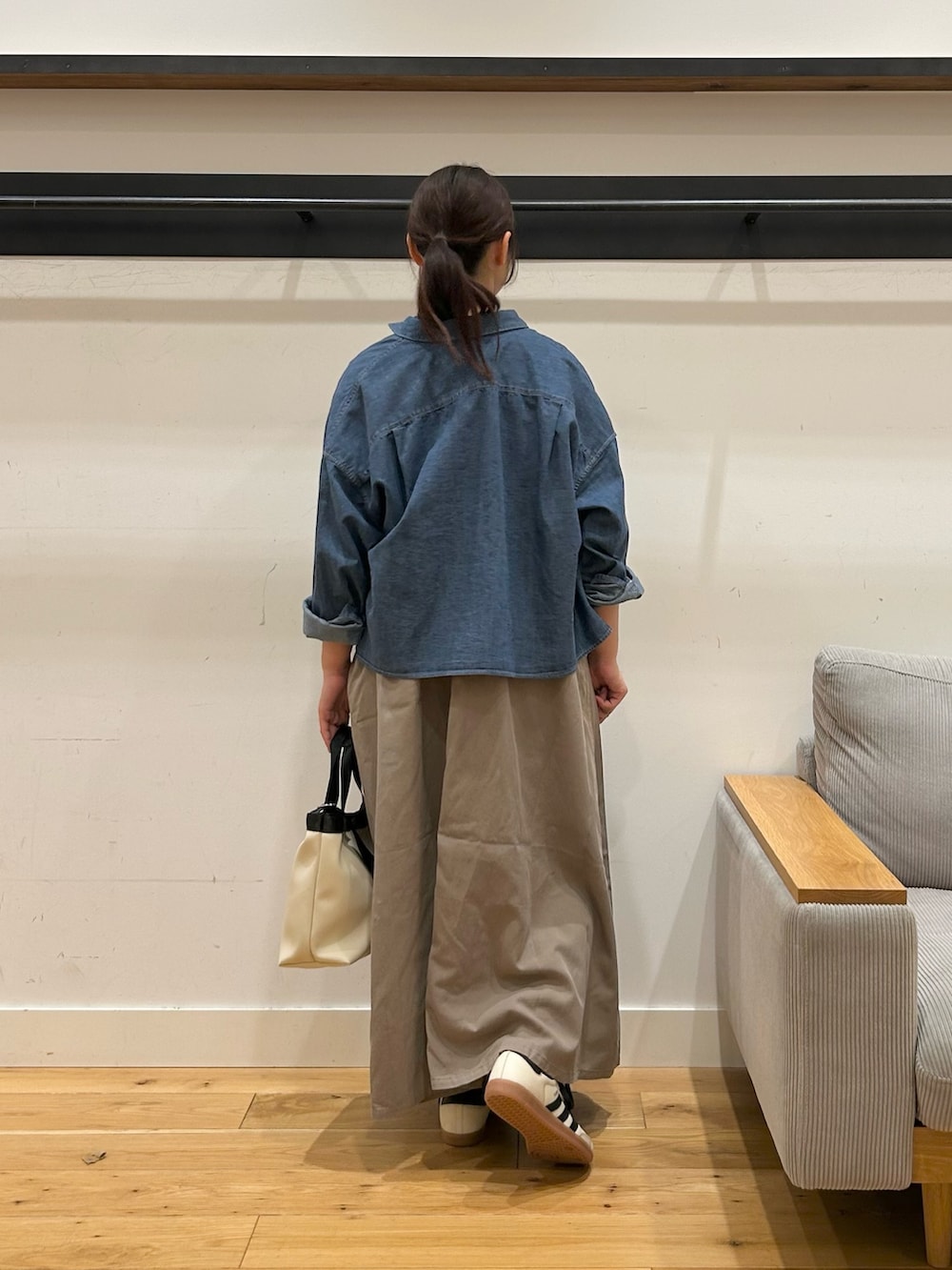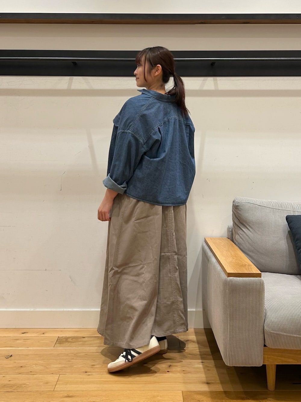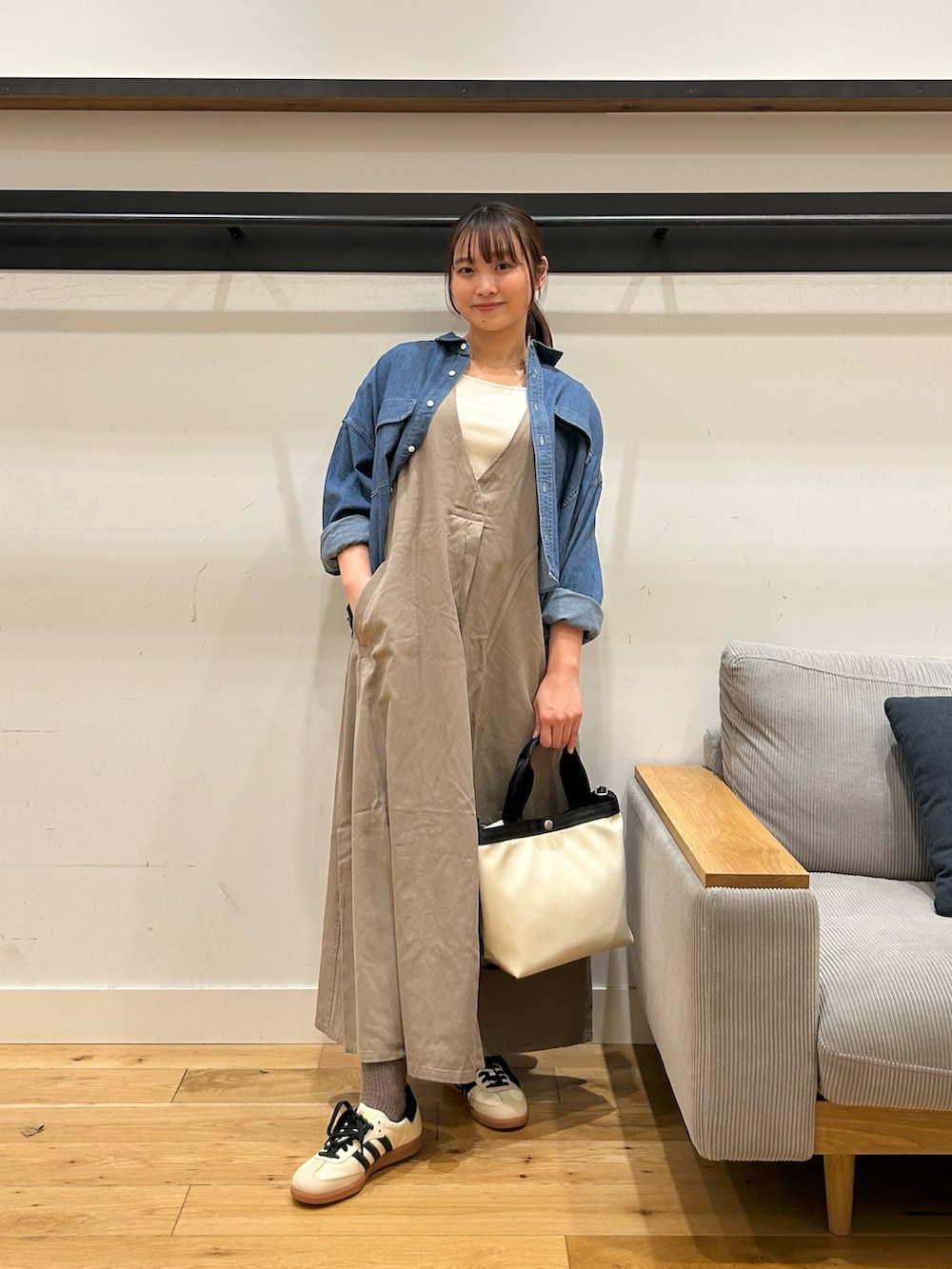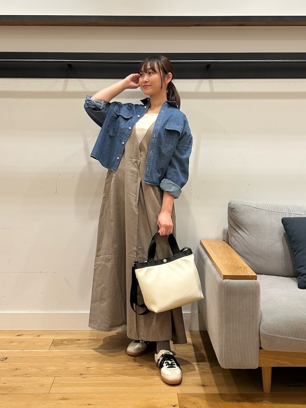 ワンピース自体ウエストマークが無いので、デニムショート丈シャツのようなコンパクトなアイテムを合わせると、スタイルアップして見えるのでオススメです✨