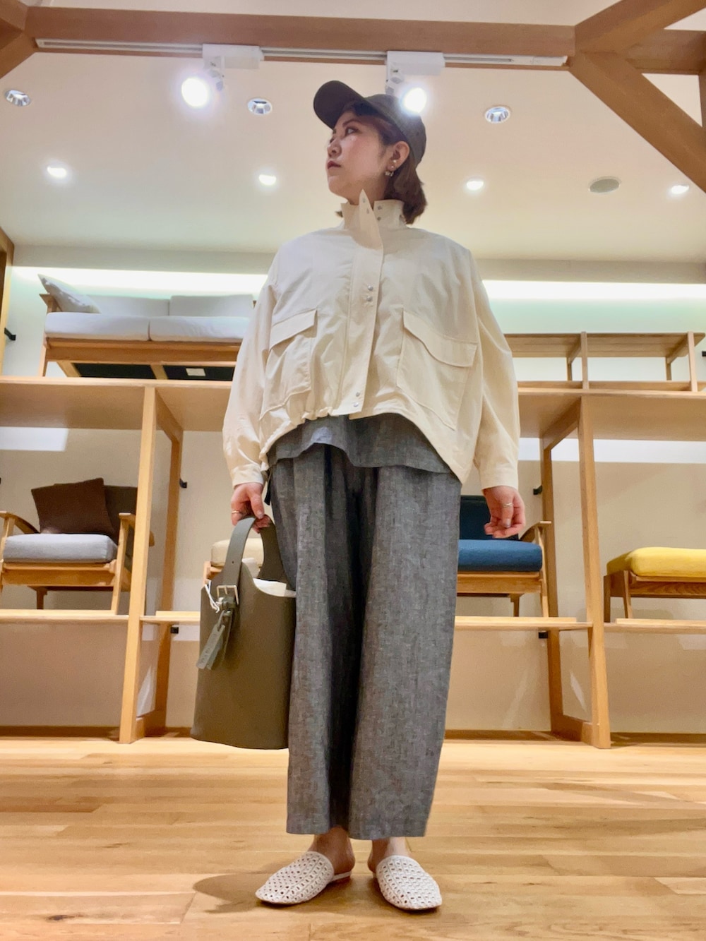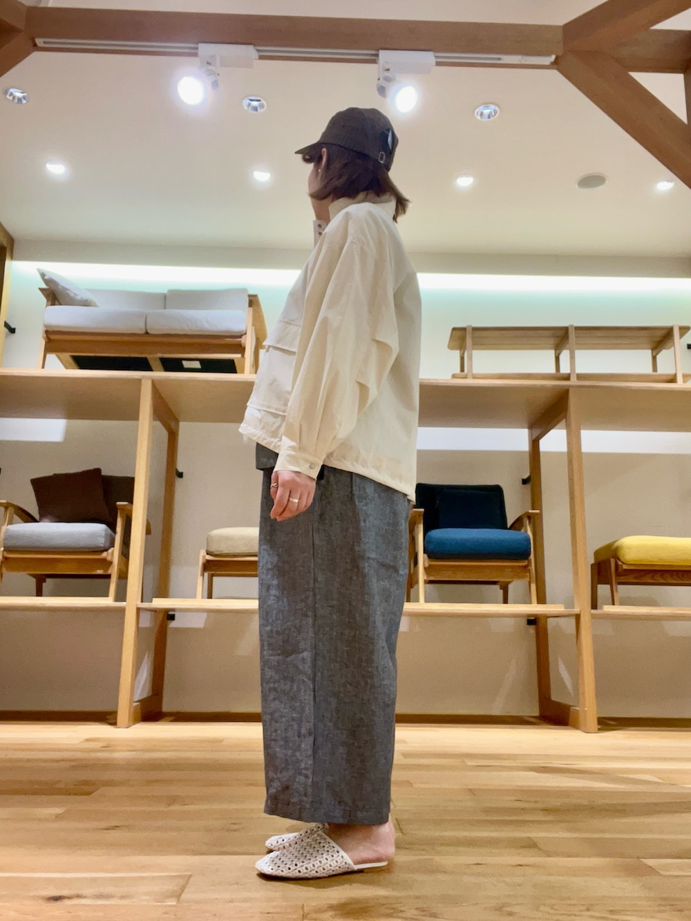 ボトムはSサイズの短めの長さにしスリッパサンダルを合わせ軽やかにしました‼︎