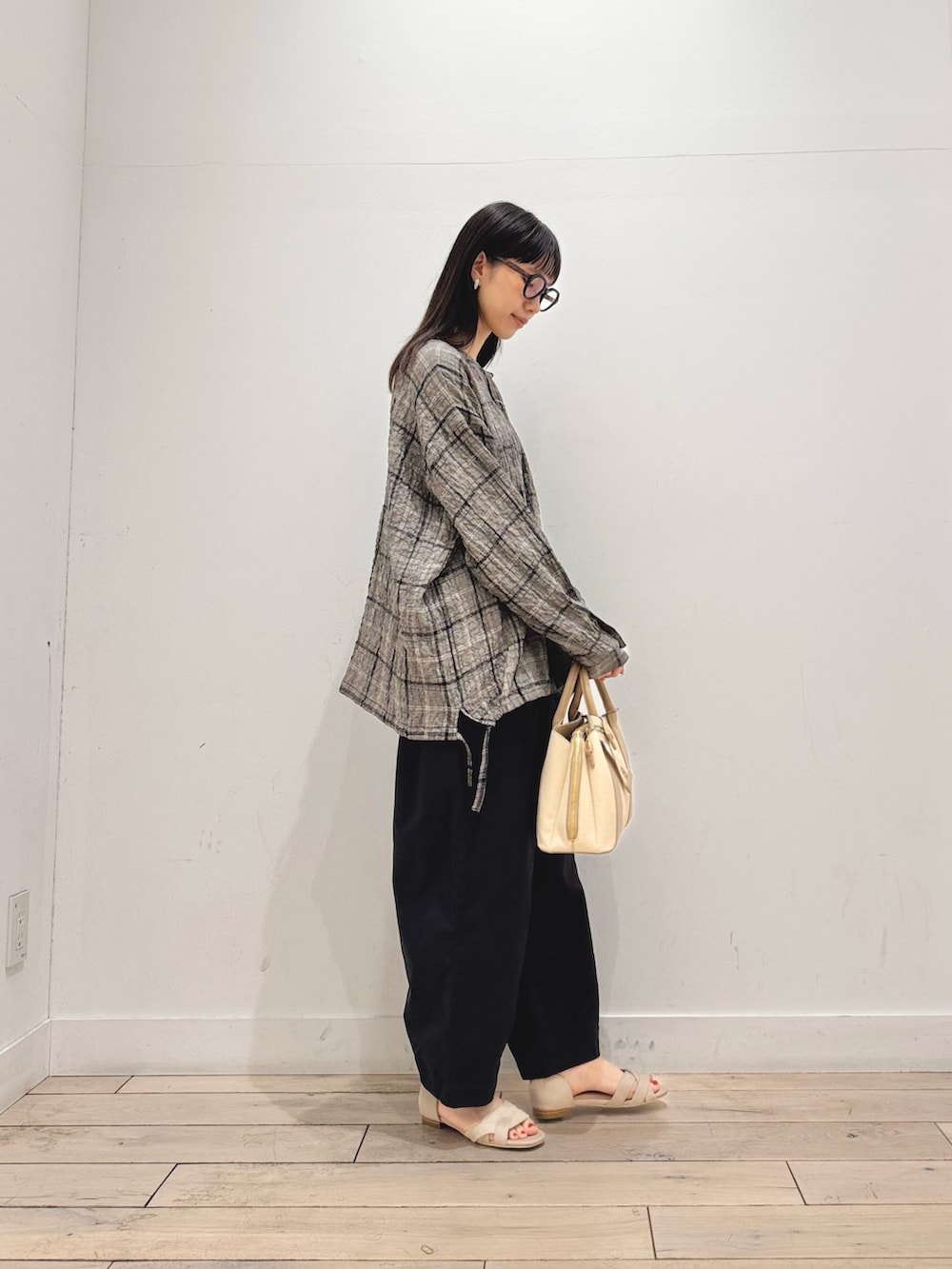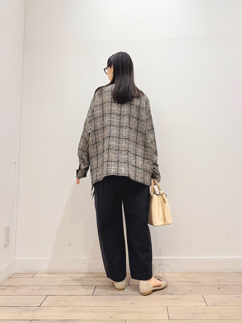 モノトーンチェックなので派手さもなく、合わせやすくなってます☺️裾が絞れてシルエットを変えて楽しめるのも◎