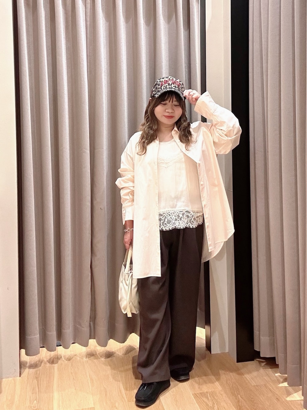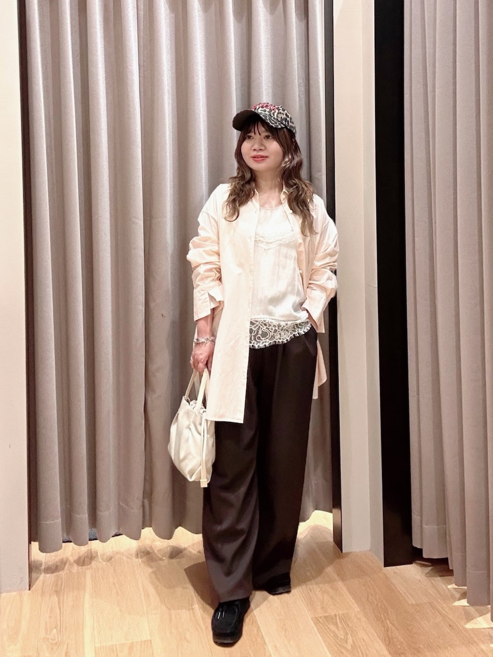 ウエアはピンクカラーのオーバーシャツにブラウンのイージーパンツでお花見コーデ🌸