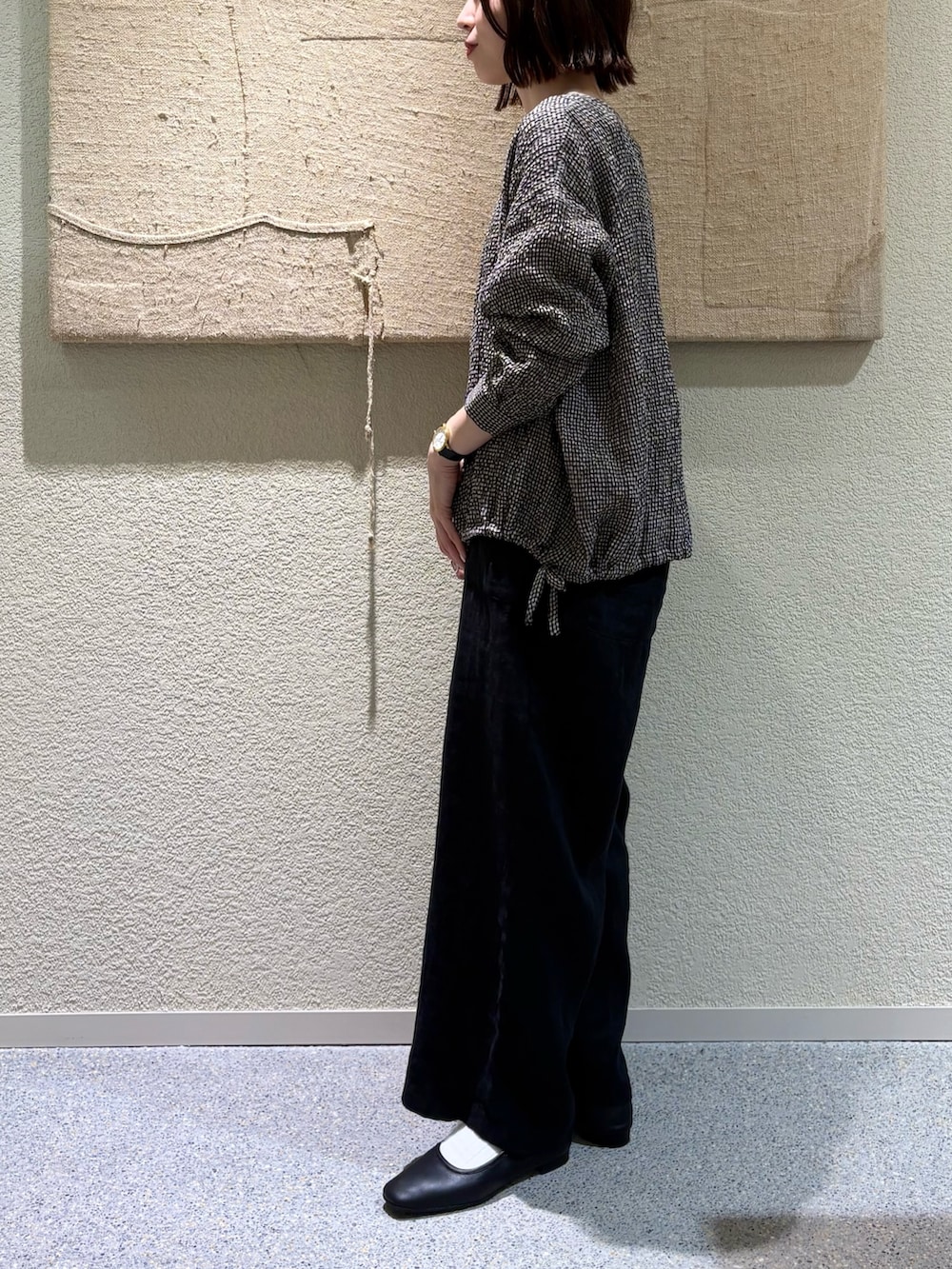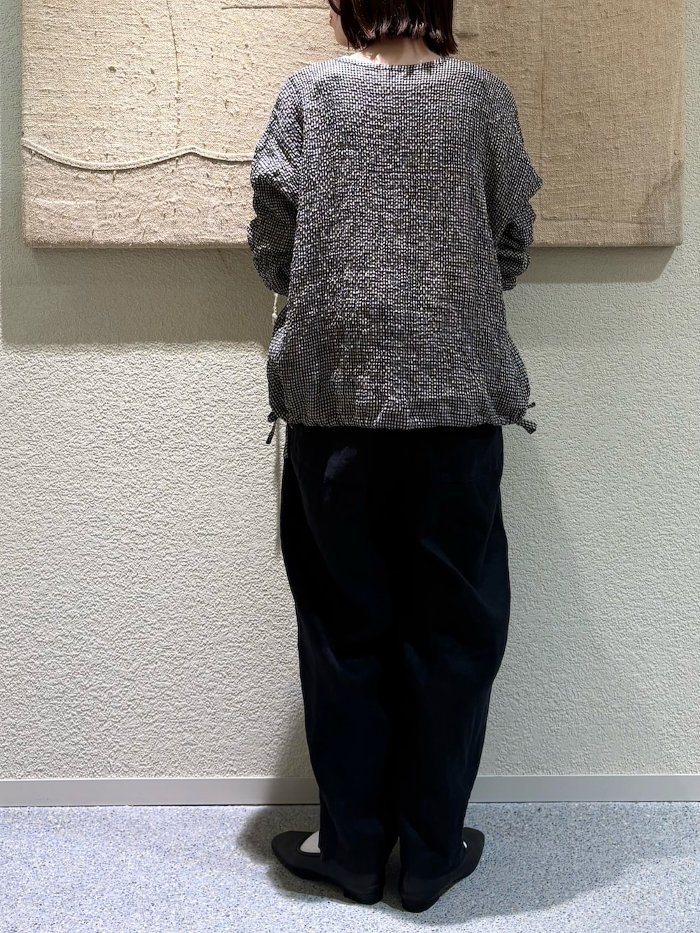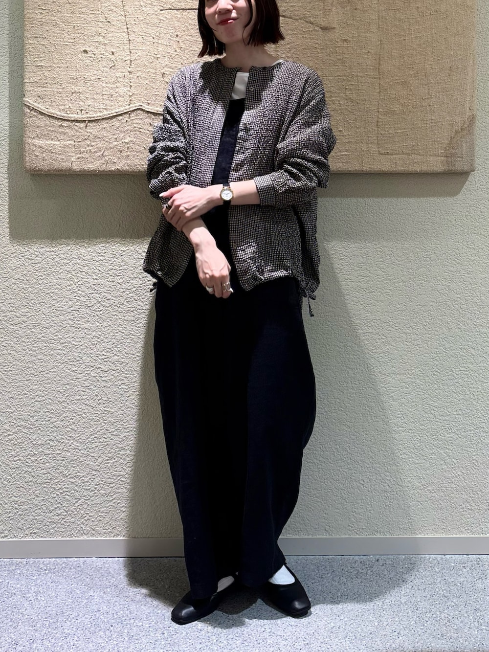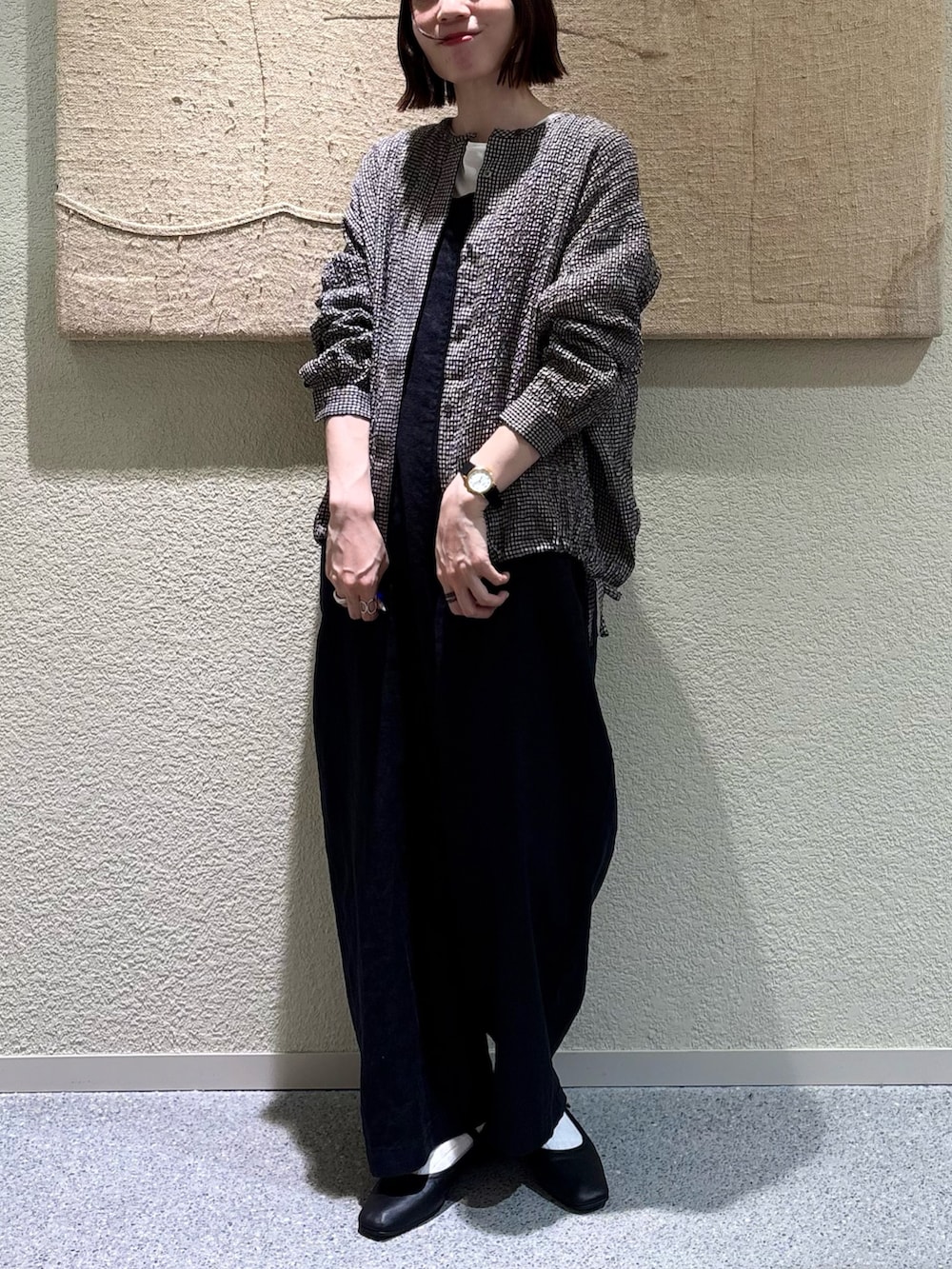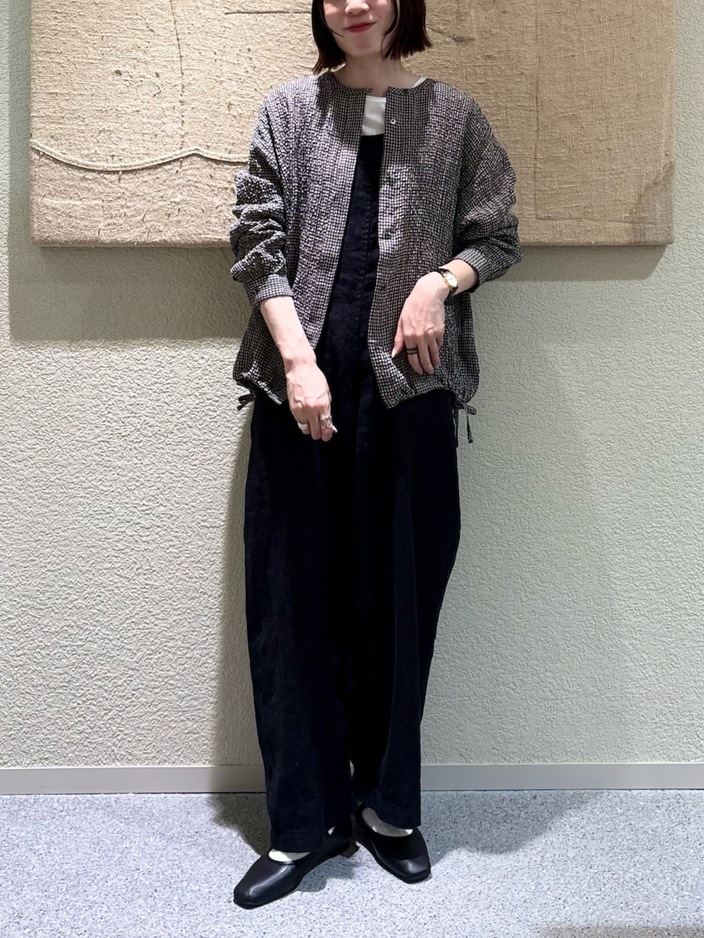 少し厚みのあるツイル生地のリネンを使用しており、ナチュラルな風合いのくたっとした雰囲気がありつつも、体型を拾いにくい生地感になっています。