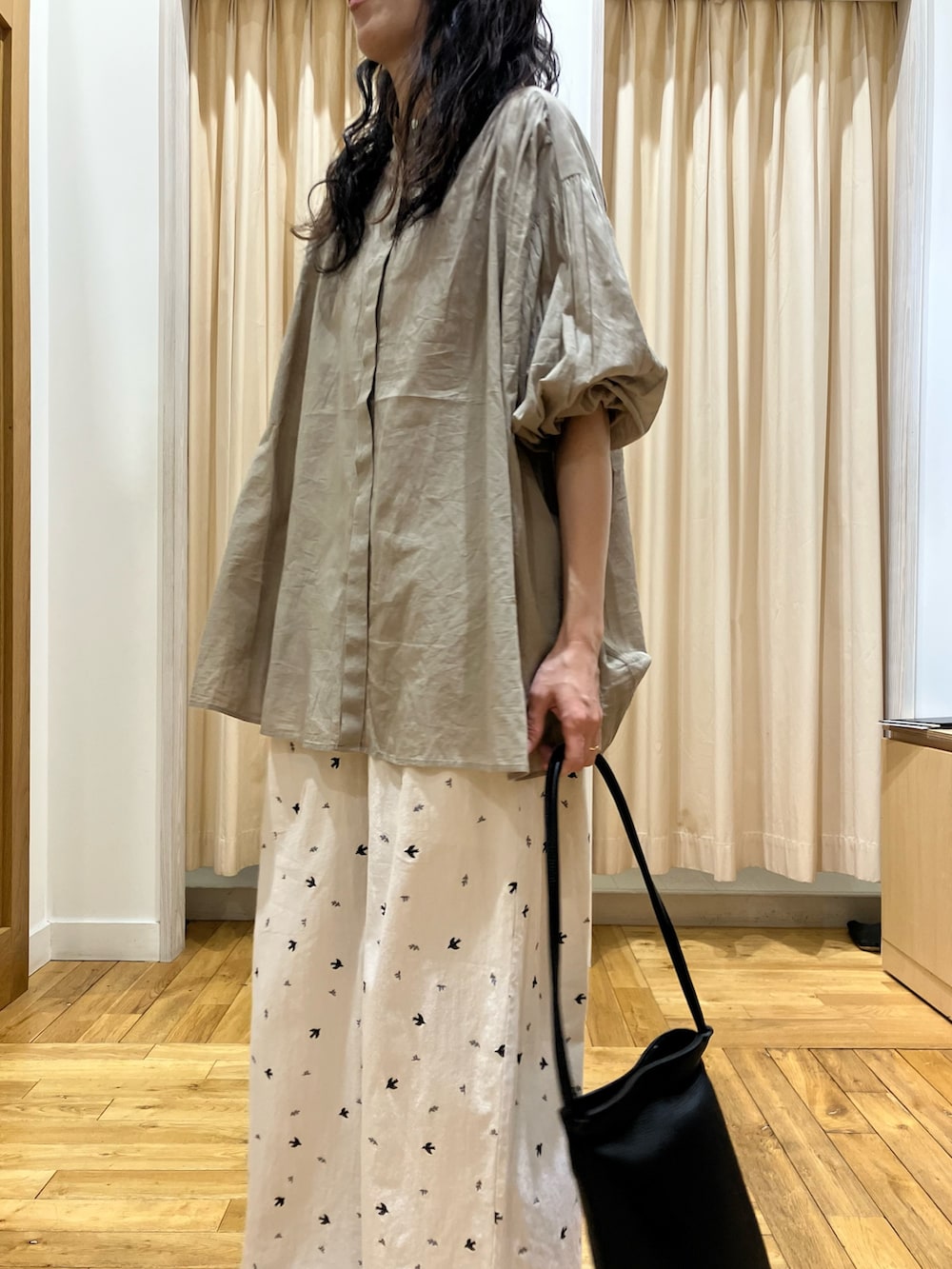 たっぷりワイドなシルエットで体型もカバーしてくれます。袖口がゴムなので、気温調節もしやすく、あげるとさらにふんわり袖ボリュームになり、女性らしい雰囲気に。