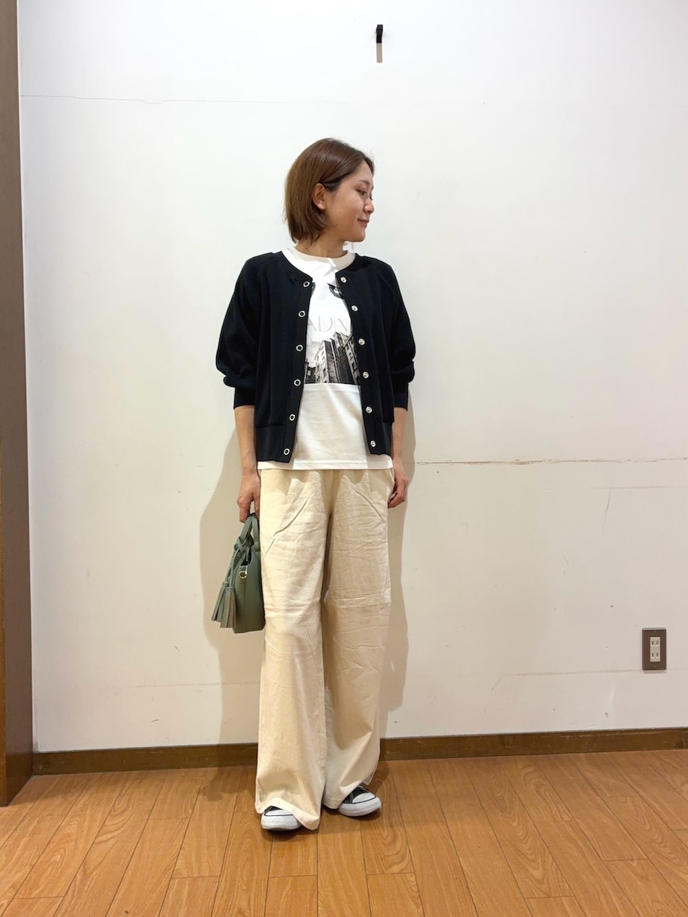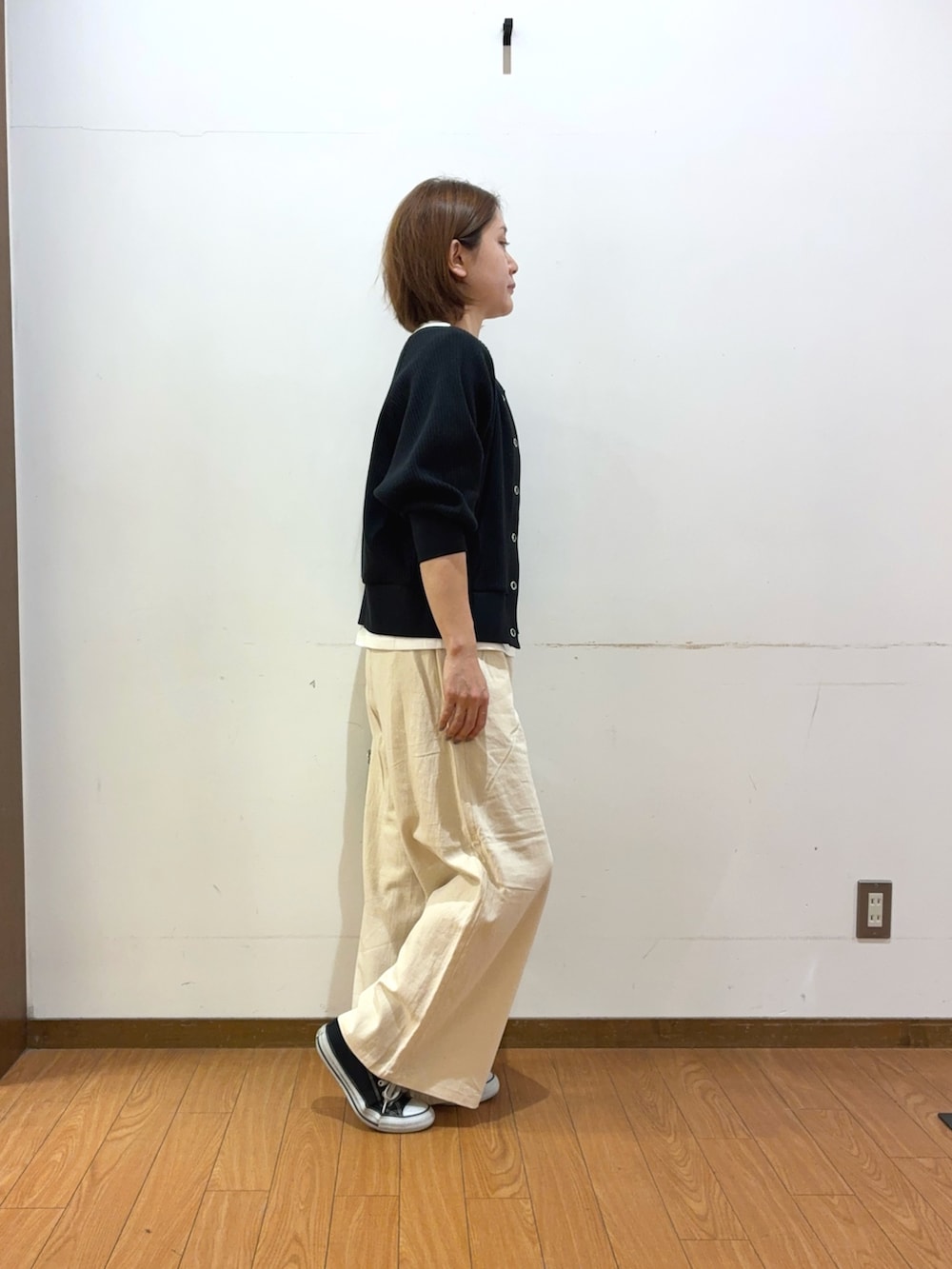 サイズ感も丁度よく、スカートにもパンツにも合わせやすい着丈の長さになっています♪