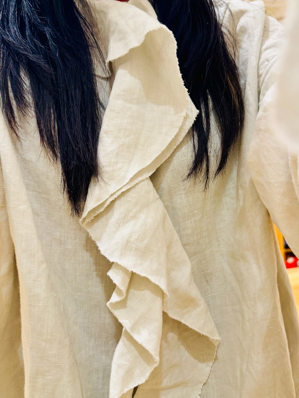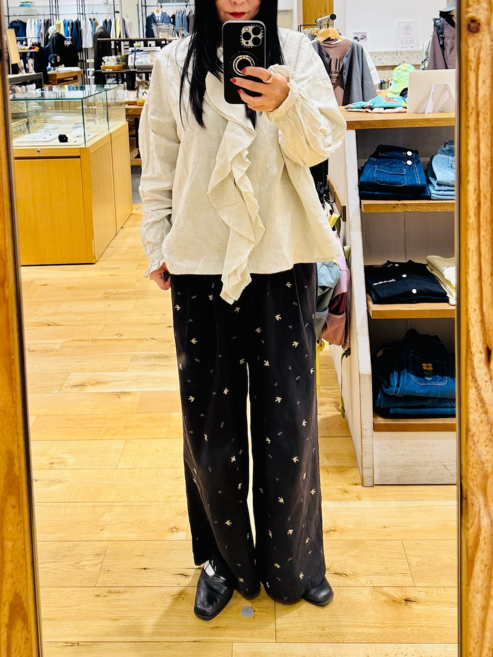 ツバメ刺繍がとても可愛くて一目惚れで購入しました♡かぐれらしいシルエットで履き心地も最高です👍リネンのフリルシャツは予約の時から欲しかったアイテムです!大きいフリルでシンプル好きな私でもリネンの柔らかい素材のお陰でラフに着れてトップス、ボトム共にお気に入りの商品です!是非DOORSららぽーと和泉店でかぐれ商品を見に来て下さいね🥰