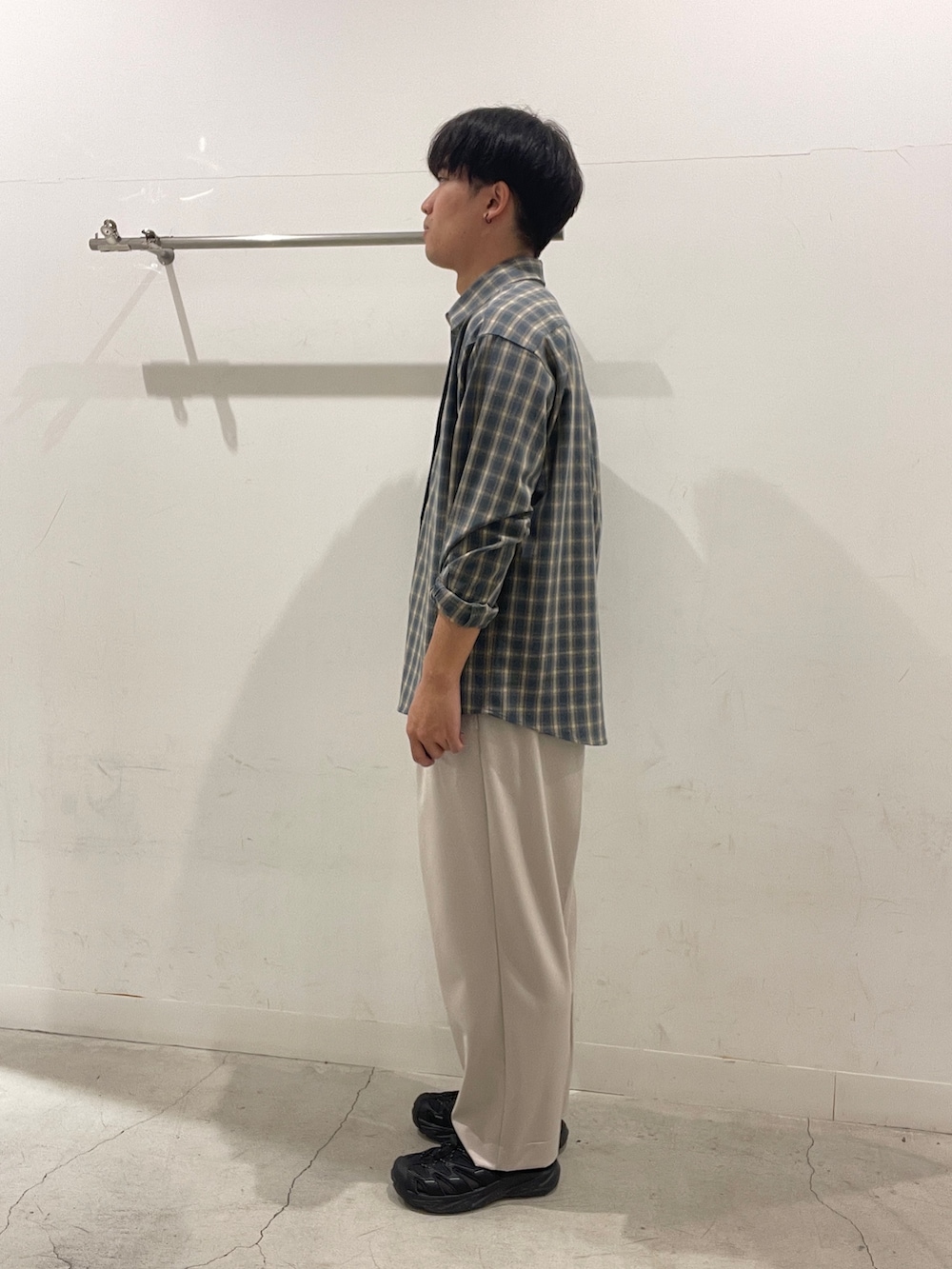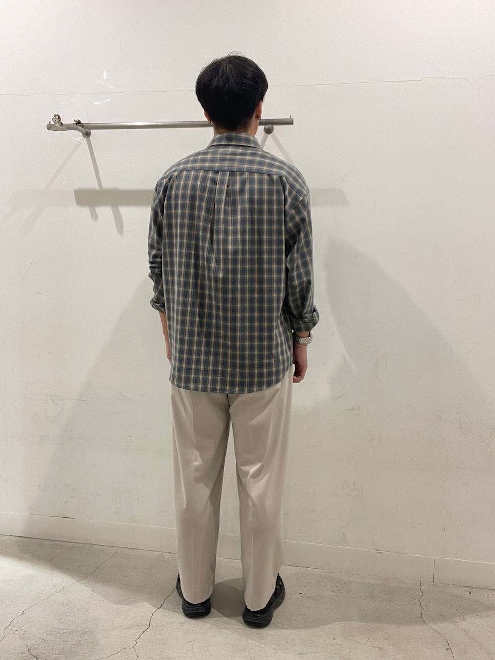 水色のチェックシャツにベージュのスラックスを合わせて、清潔感のあるコーデに!