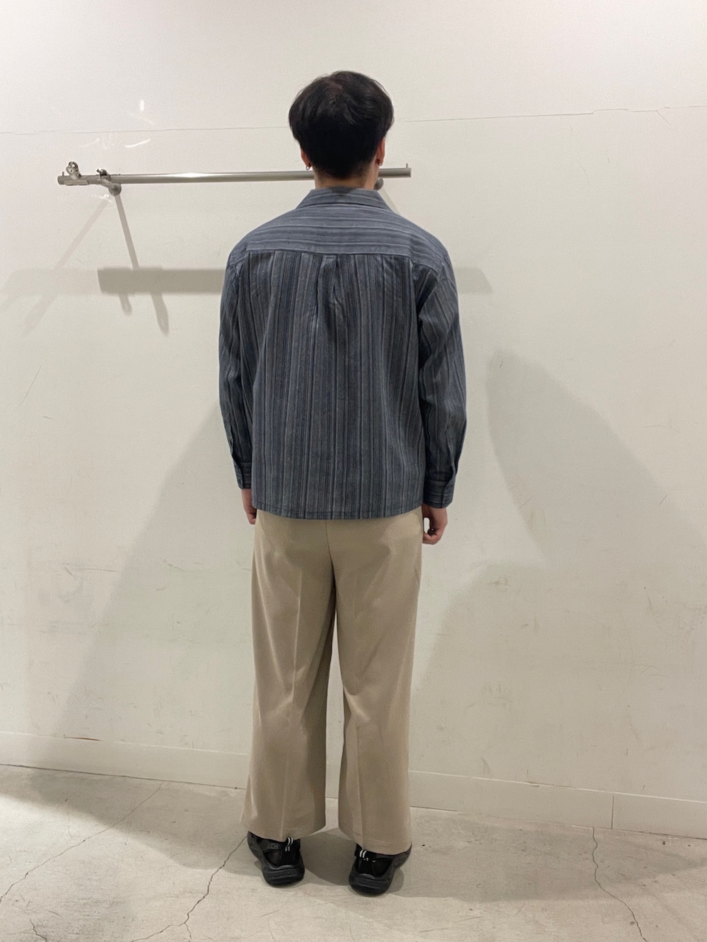 グレーのシアーストライプシャツにベージュスラックスで軽やかにまとめました!