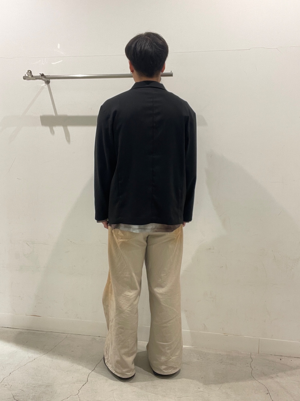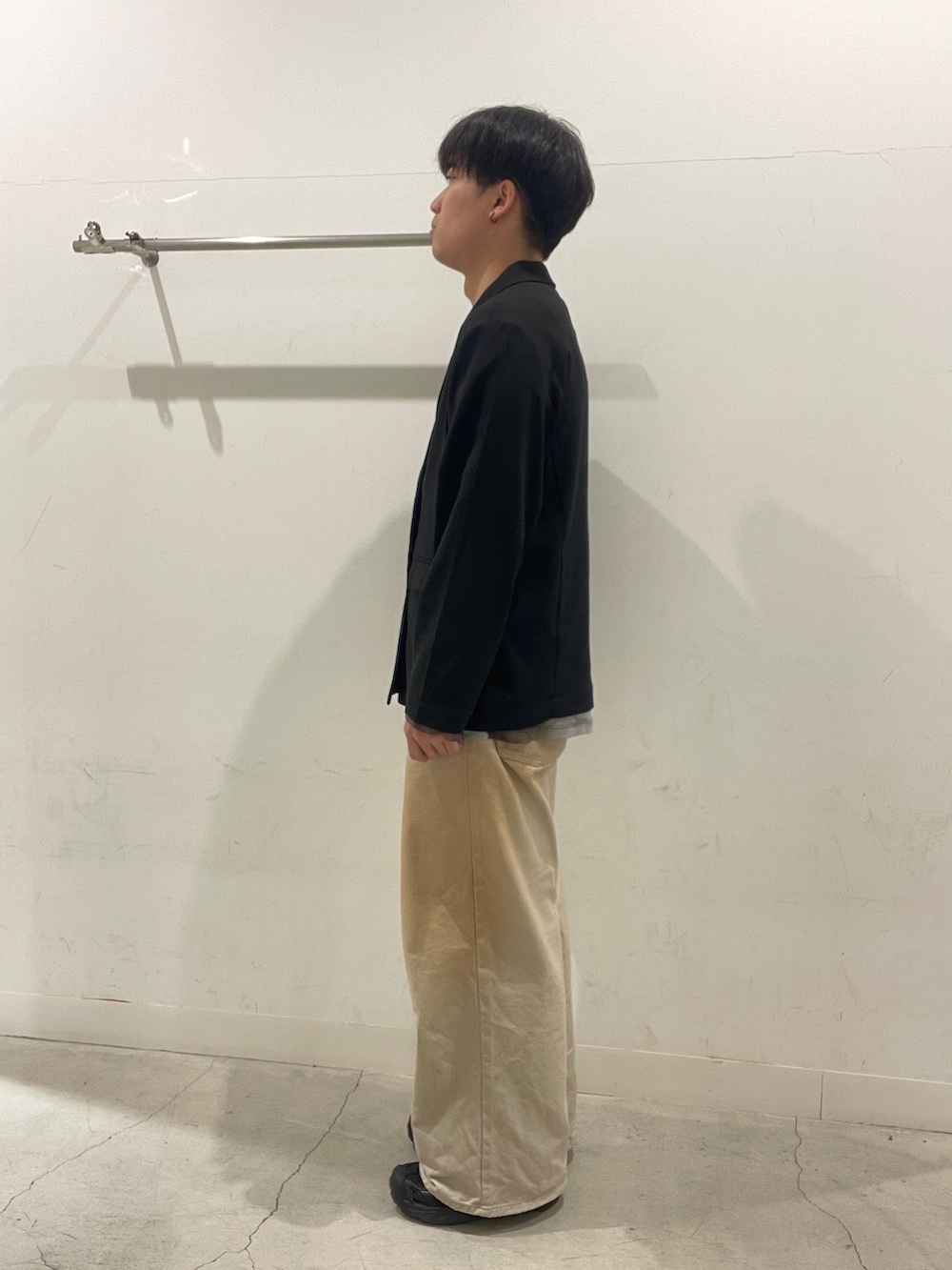 黒のジャケットで全体を引き締めつつ、水色のシアーTで軽さをプラス!