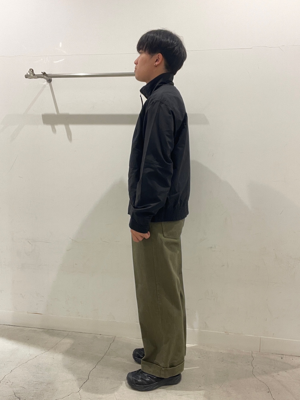ブラックのナイロンブルゾンで引き締めつつ、黄緑のヘンリーネックでアクセントをプラス!