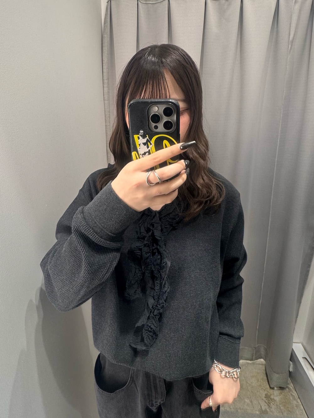 年中活躍できるビックポケットのデニムとレースのかわいいトップスを同じトーンで合わせたコーデです!