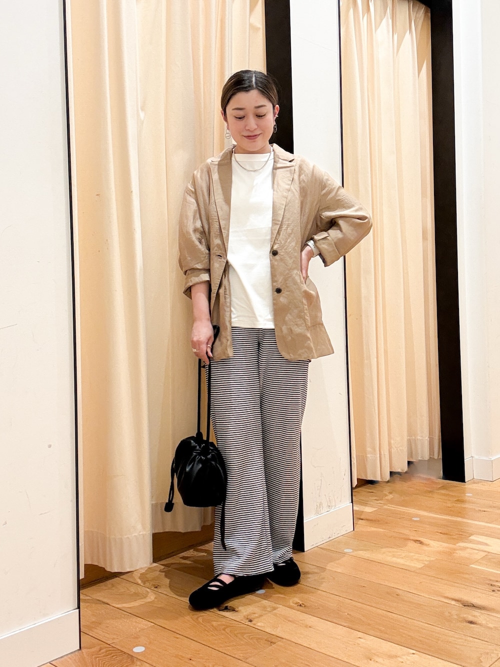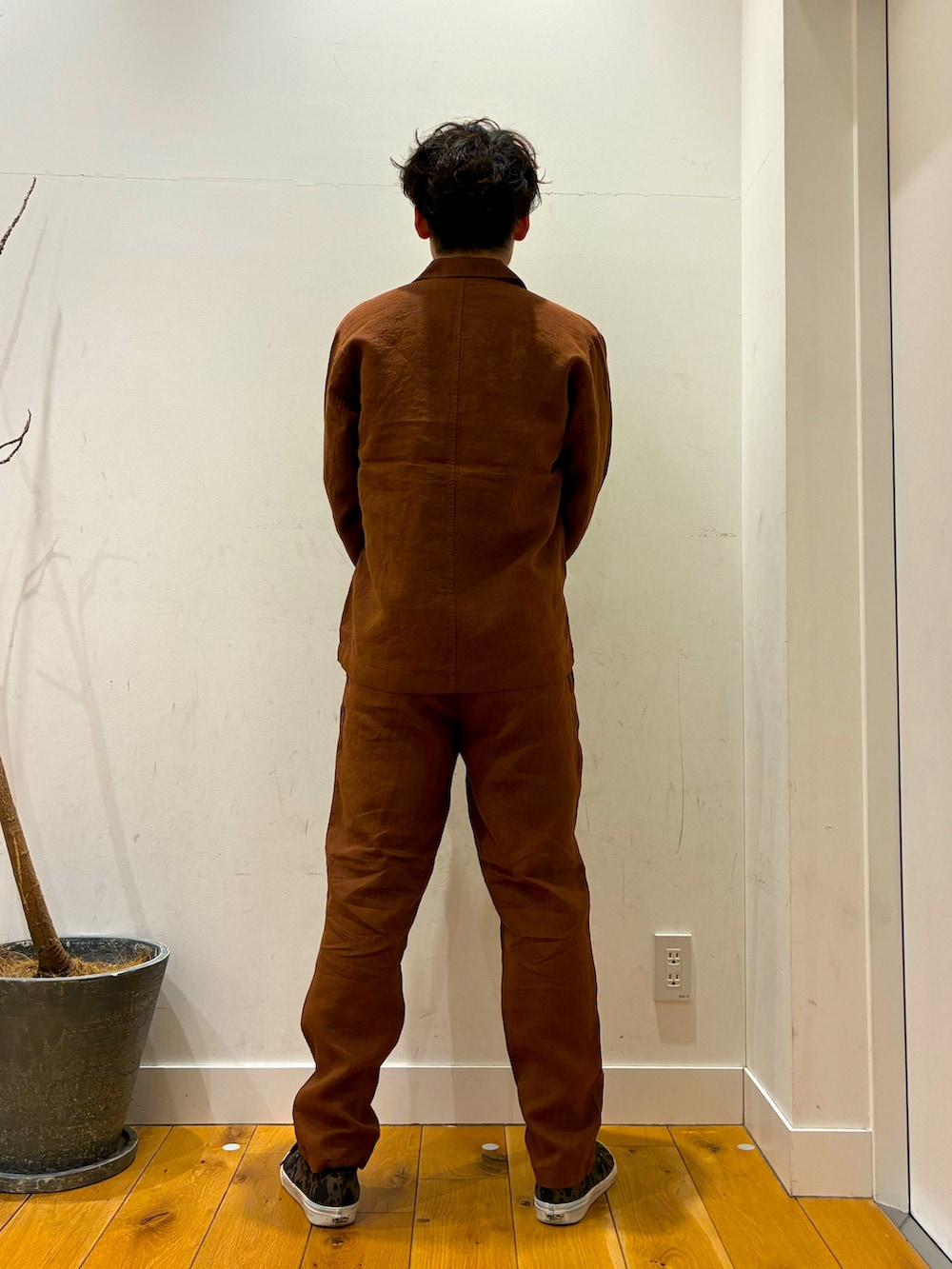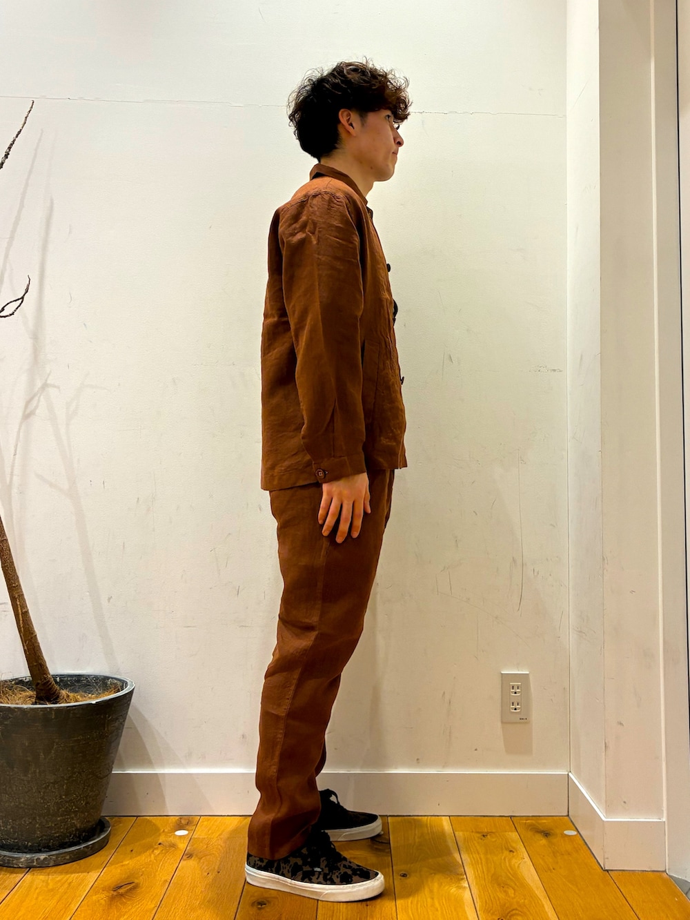 生地が厚めの半袖Tシャツを着ています!その上にはパンツとセットアップになっているリネンジャケットを羽織っています!通気性がよくこれからの時期にとてもいいです!!又、パンツはテーパードがかかっている物になっています!!