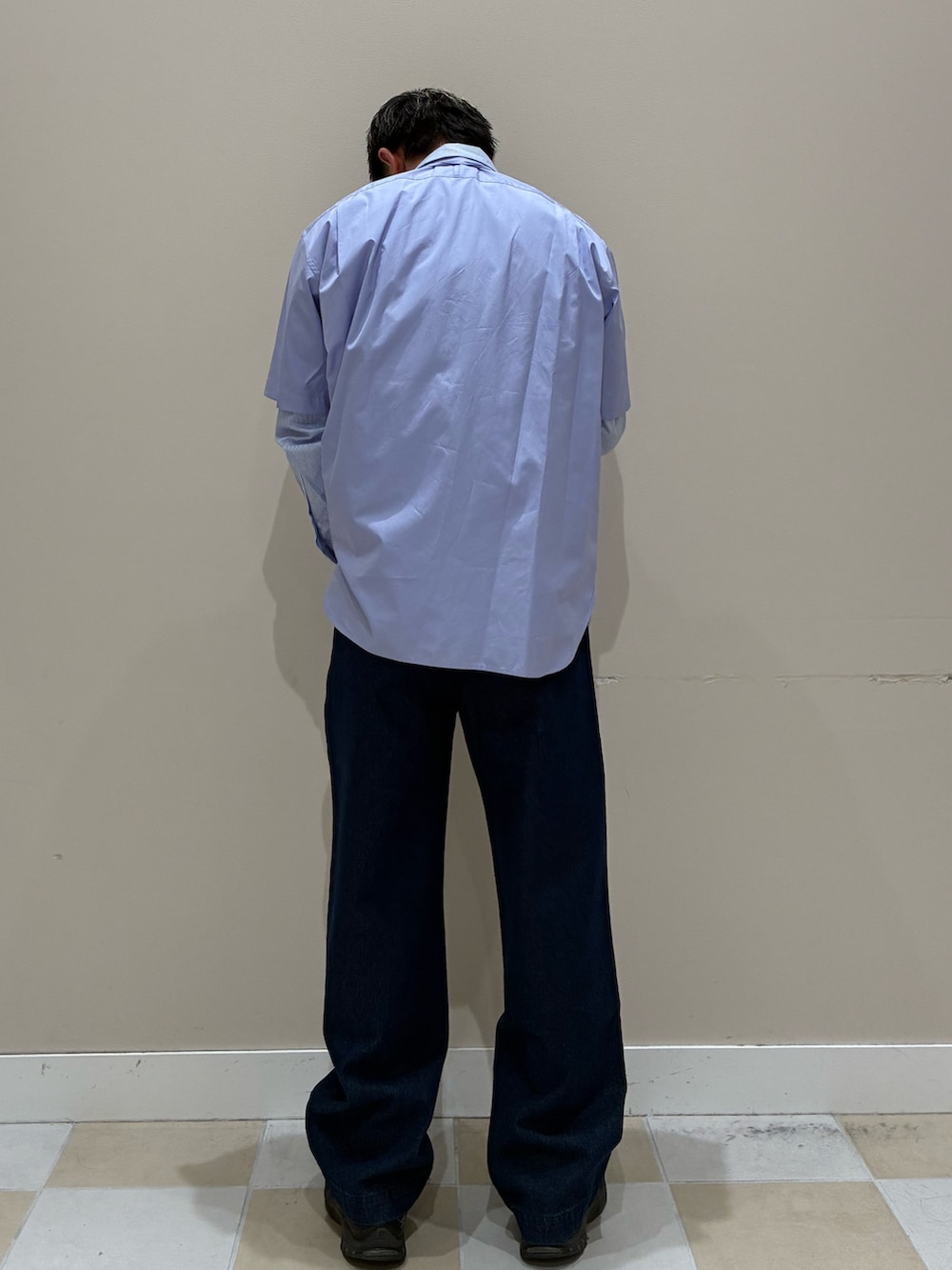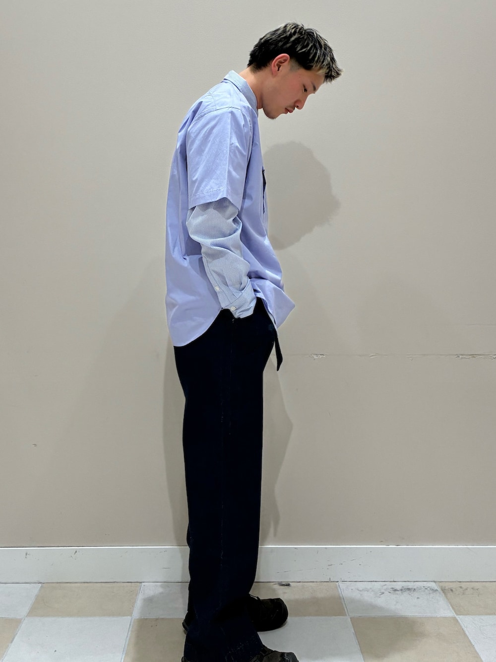 淡いブルーの半袖シャツにロングスリーブを重ねたレイヤードスタイルで、シンプルながら奥行きのある着こなしに。クリーンなカラーリングが春らしい軽やかさを演出しつつ、ワイドなデニムで程よくカジュアルダウン。足元は落ち着いたシューズで引き締め、大人っぽいバランスに仕上げています。
