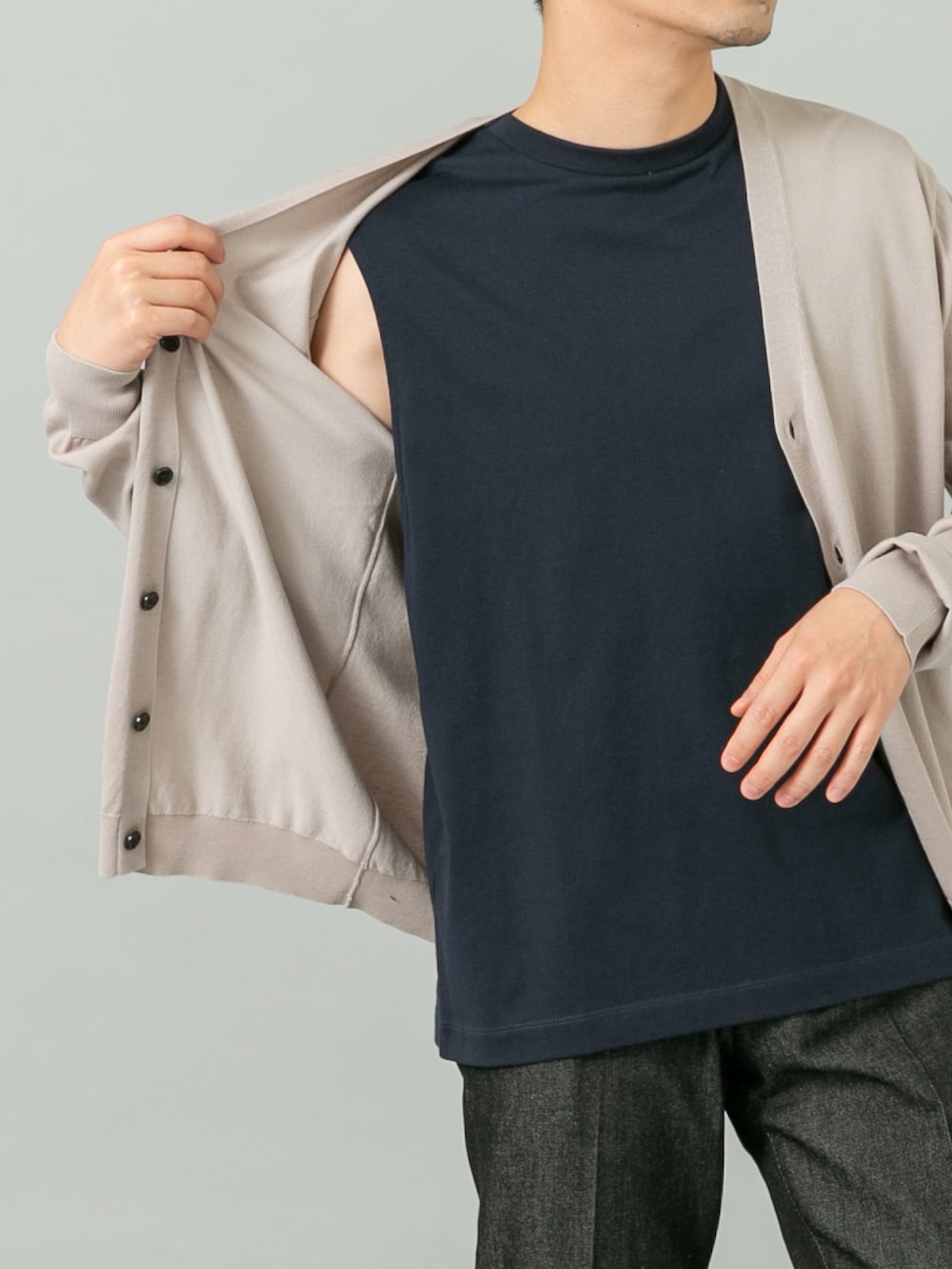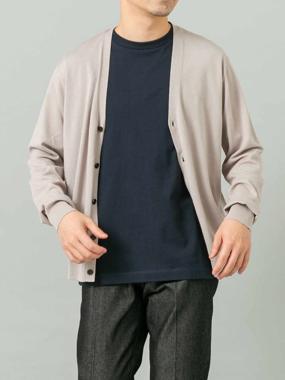 カーディガンはLサイズで元々やや細身のシルエットなのでややゆとりが出る感じです。