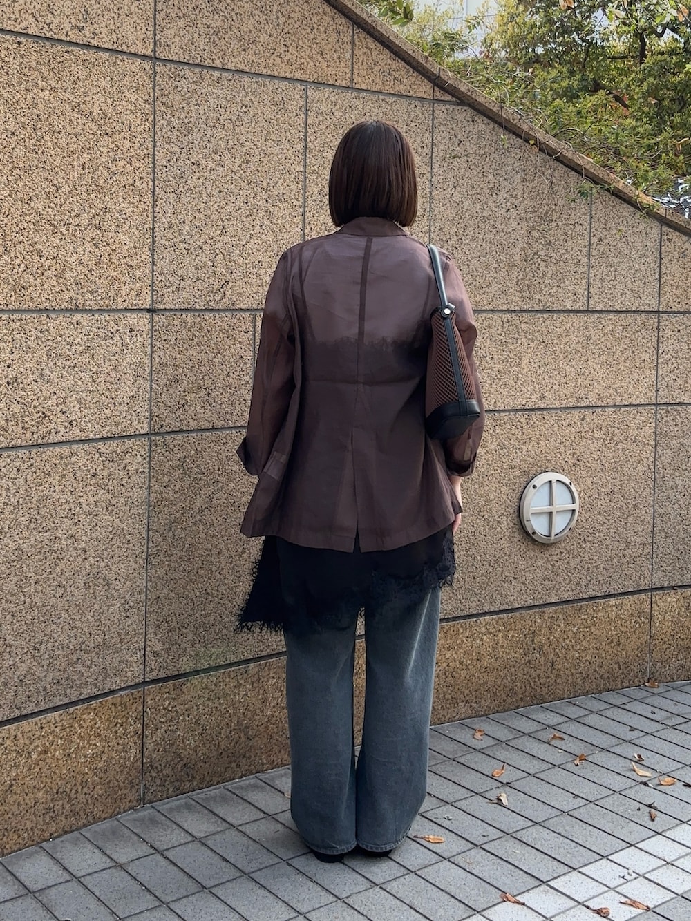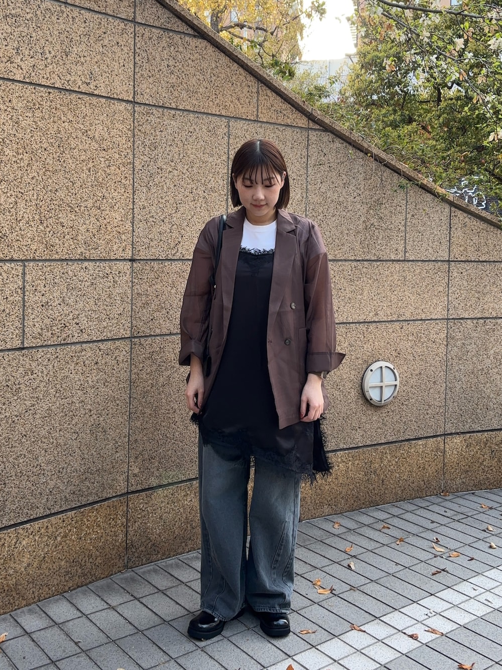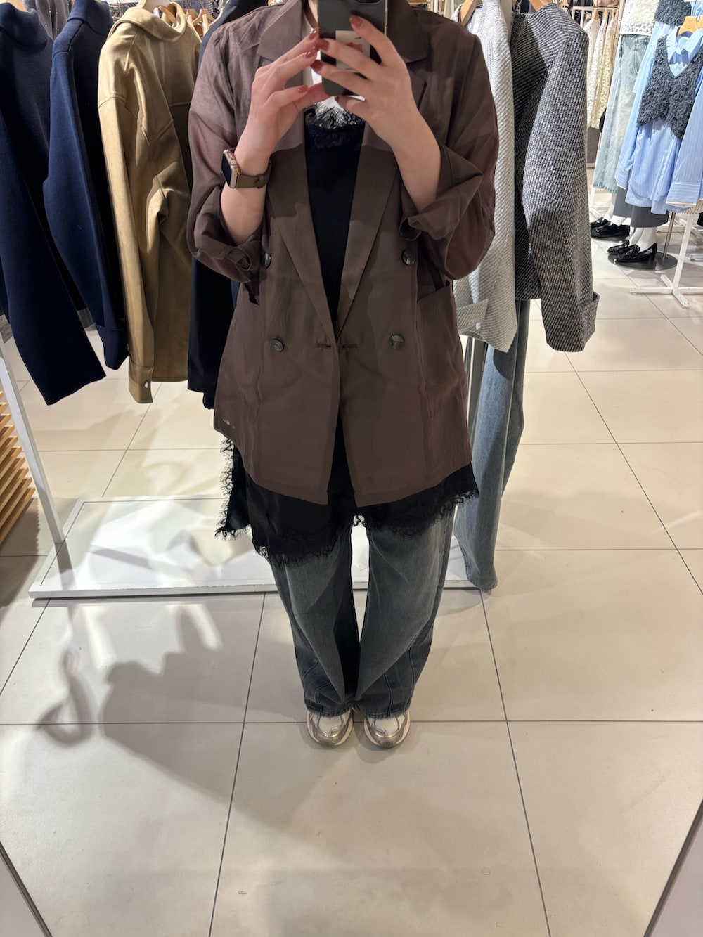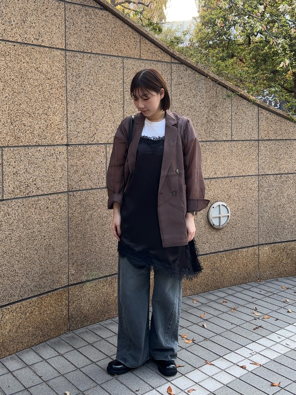 シアーのジャケットにサテンレースキャミを合わせてトレンド感も出しつつお尻周りも隠せて着痩せ効果も💫