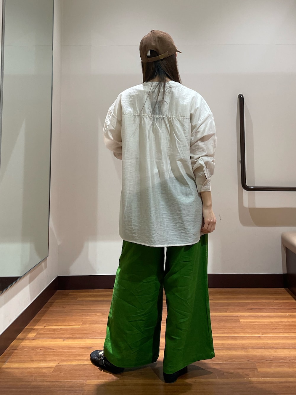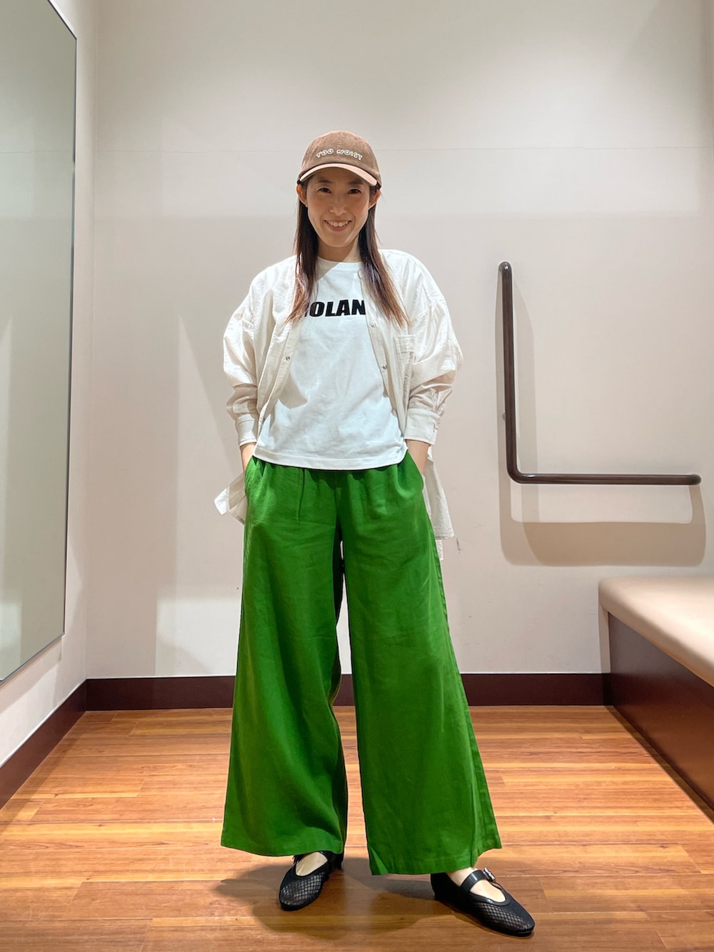 グリーンカラーがポイントのパンツは1つ持っているとコーディネートが華やかになりオススメ‼︎