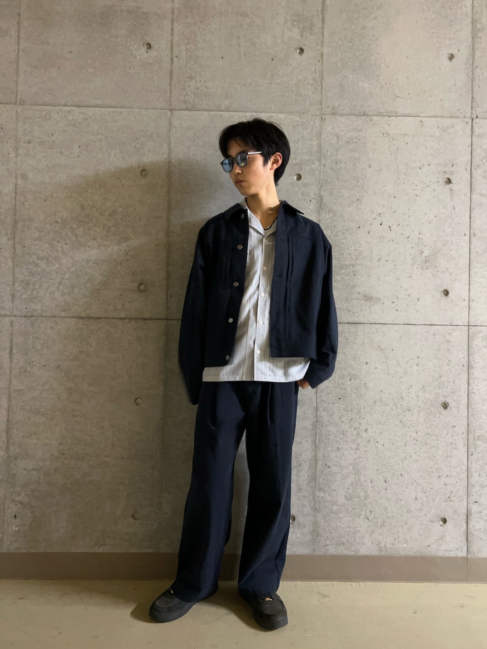 全体をネイビーで統一することで落ち着いた大人っぽさを演出しつつ、インナーに白シャツを取り入れることで抜け感と清潔感をプラスしています。シルエットはジャケット・パンツともにややゆとりを持たせ、リラックス感のある今っぽいバランスに仕上げているのが特徴です!また、短丈のジャケットを合わせることでスタイルアップ効果を生み、ワイドパンツとの相性も良く、サングラスを取り入れることでシンプルなコーディネートにアクセントを加え、全体の雰囲気を引き締めています。ぜひ試してみてください!