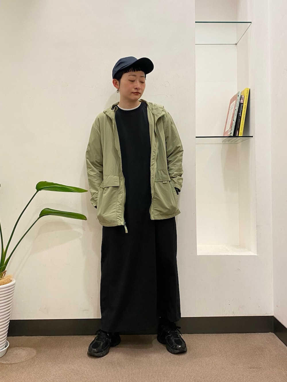 カジュアルなカットワンピは、アウターを主役に他をダークカラーで統一してみました。