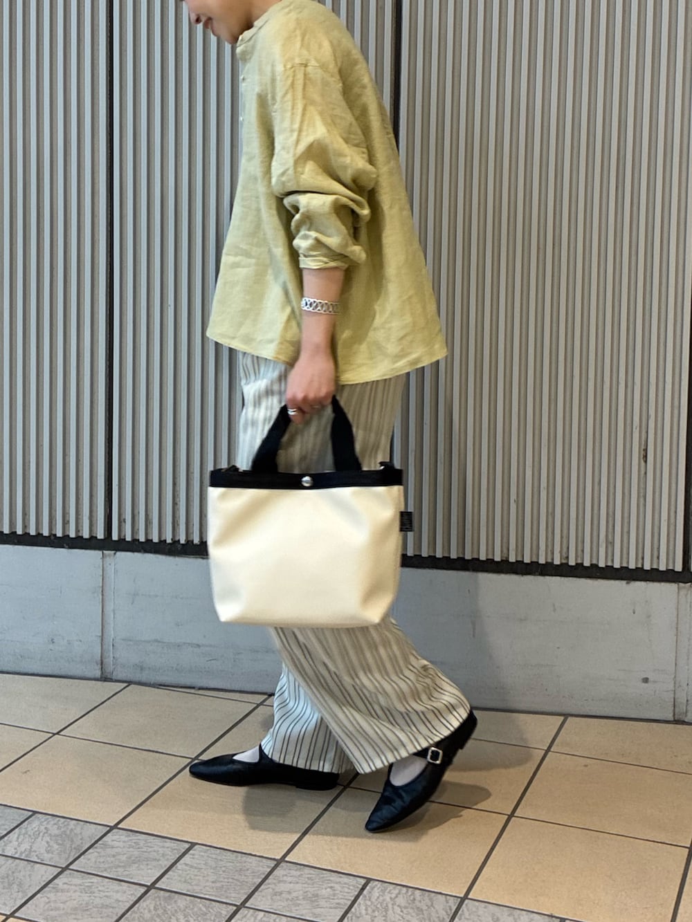 コーディネートのポイントは淡いカラーの色合わせなのでのっぺりし過ぎないように、靴やインナー、バッグに黒を差し込んでアクセントにしたところがポイントです!!