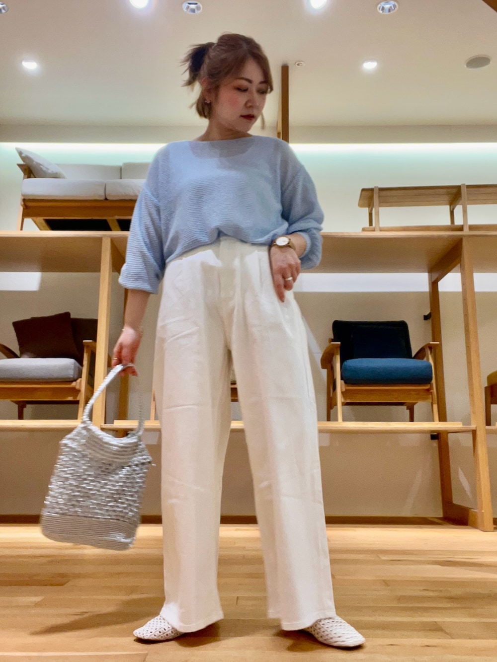 Blueのニットは透け感があるのでスクエアネックのタンクトップを合わせ軽やかに‼︎