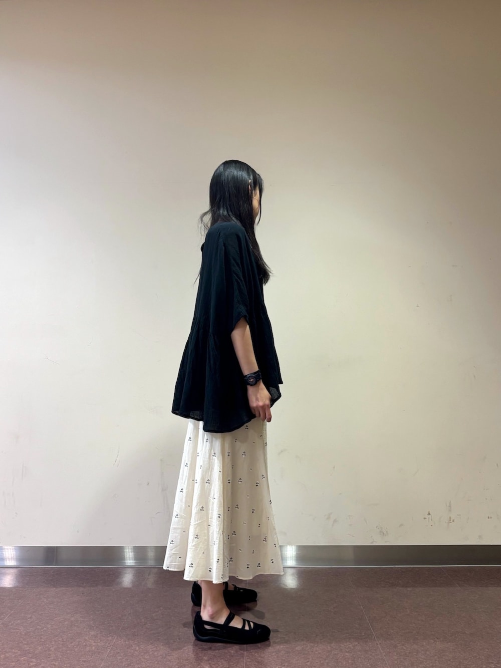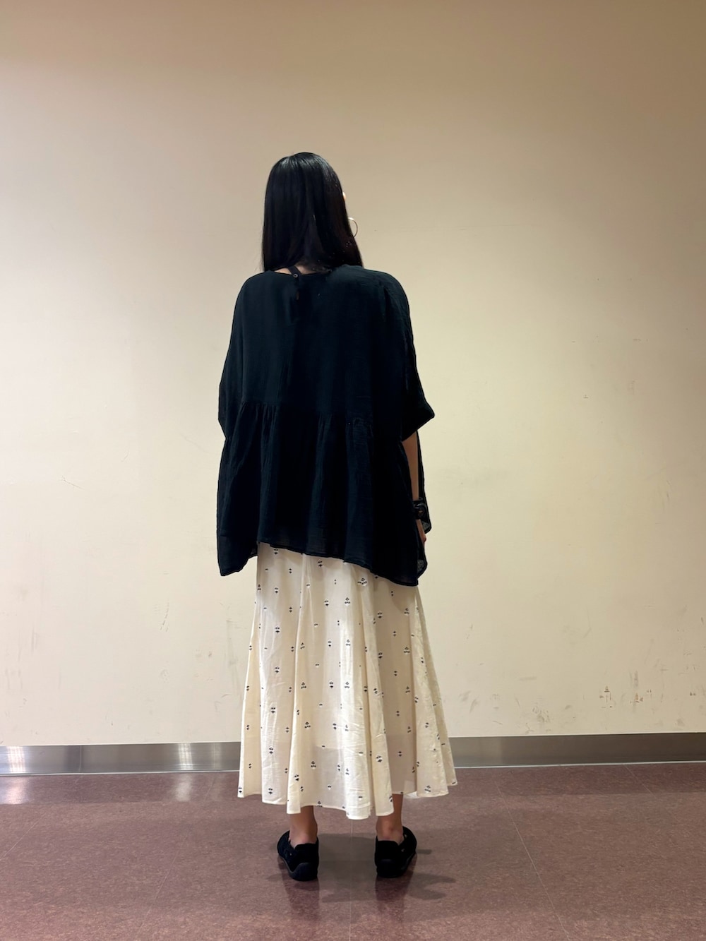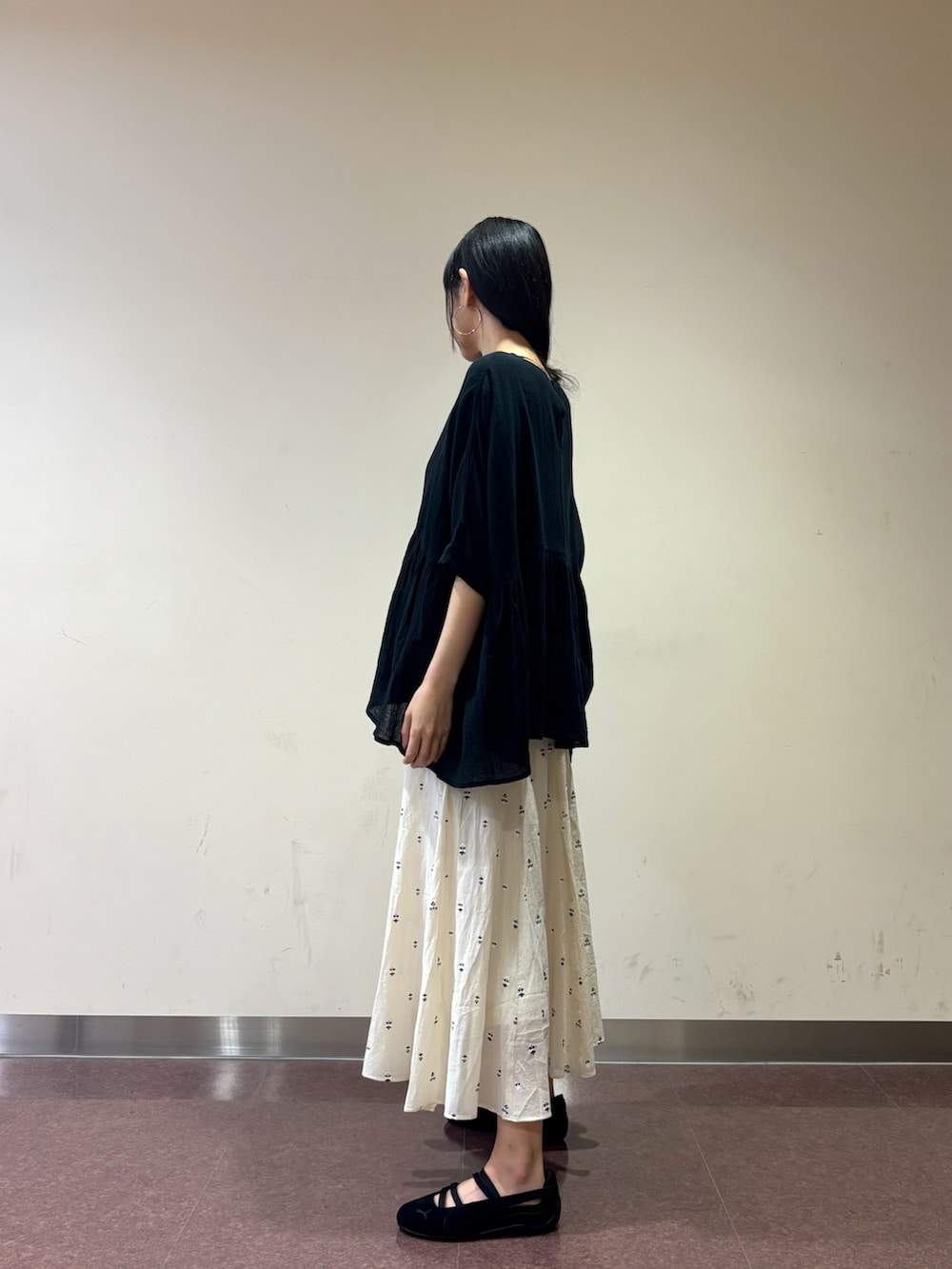 フレアスカートにかぐれのコットンクレープギャザーブラウスを合わせました。