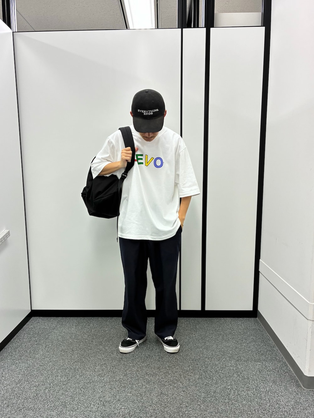 プリントTシャツにイージースラックス、