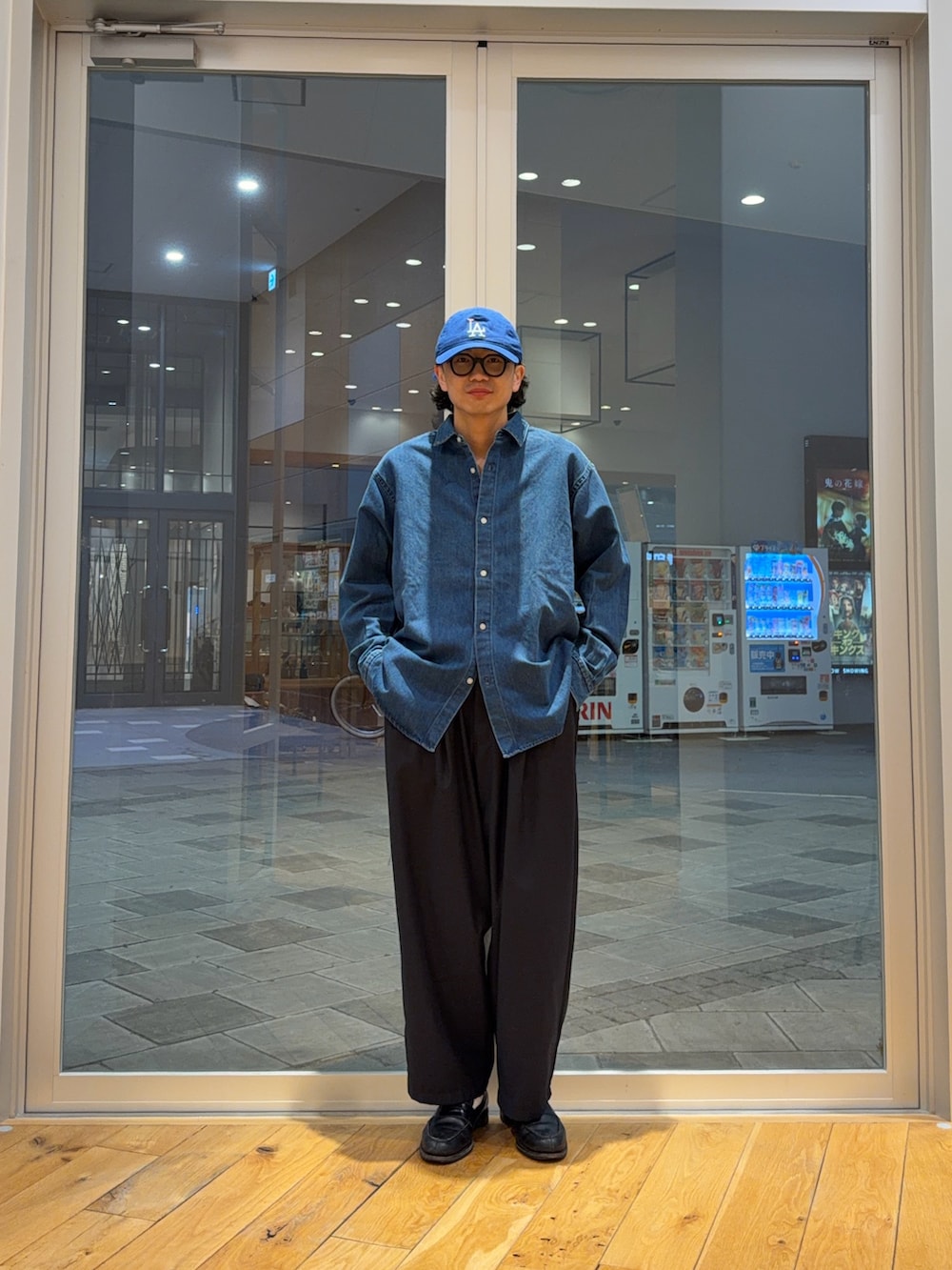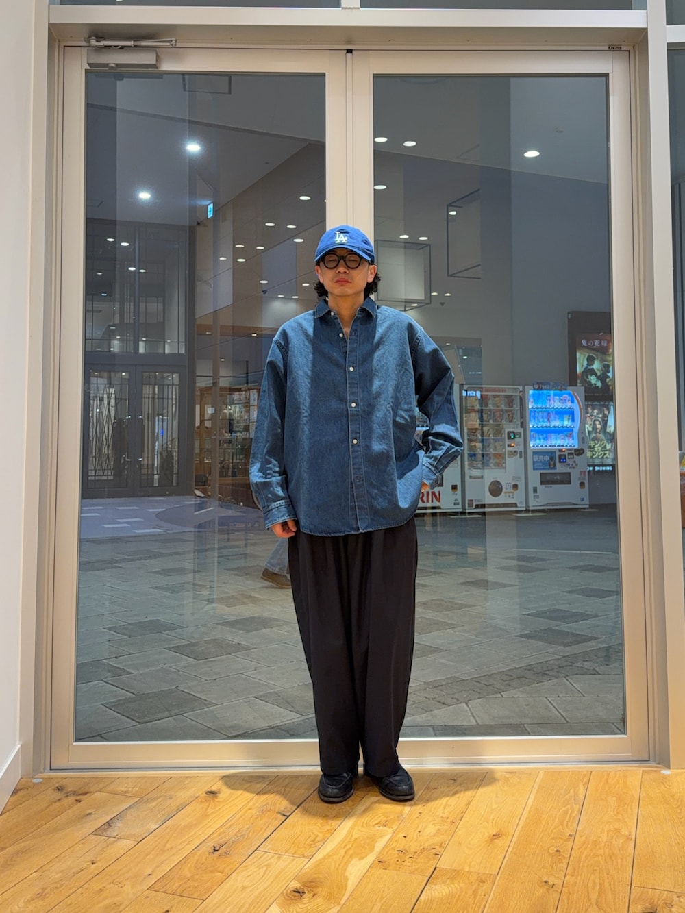 デニムシャツに太めのスラックス。