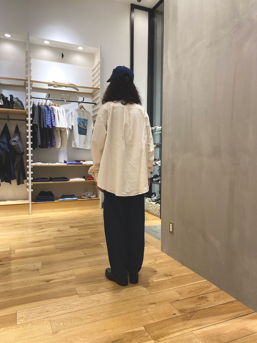 白シャンブレーにスラックス見えするパンツを合わせてカジュアルすぎないバランスを楽しみました。