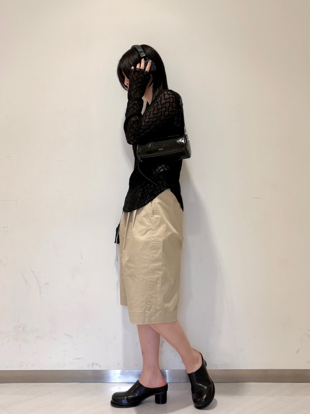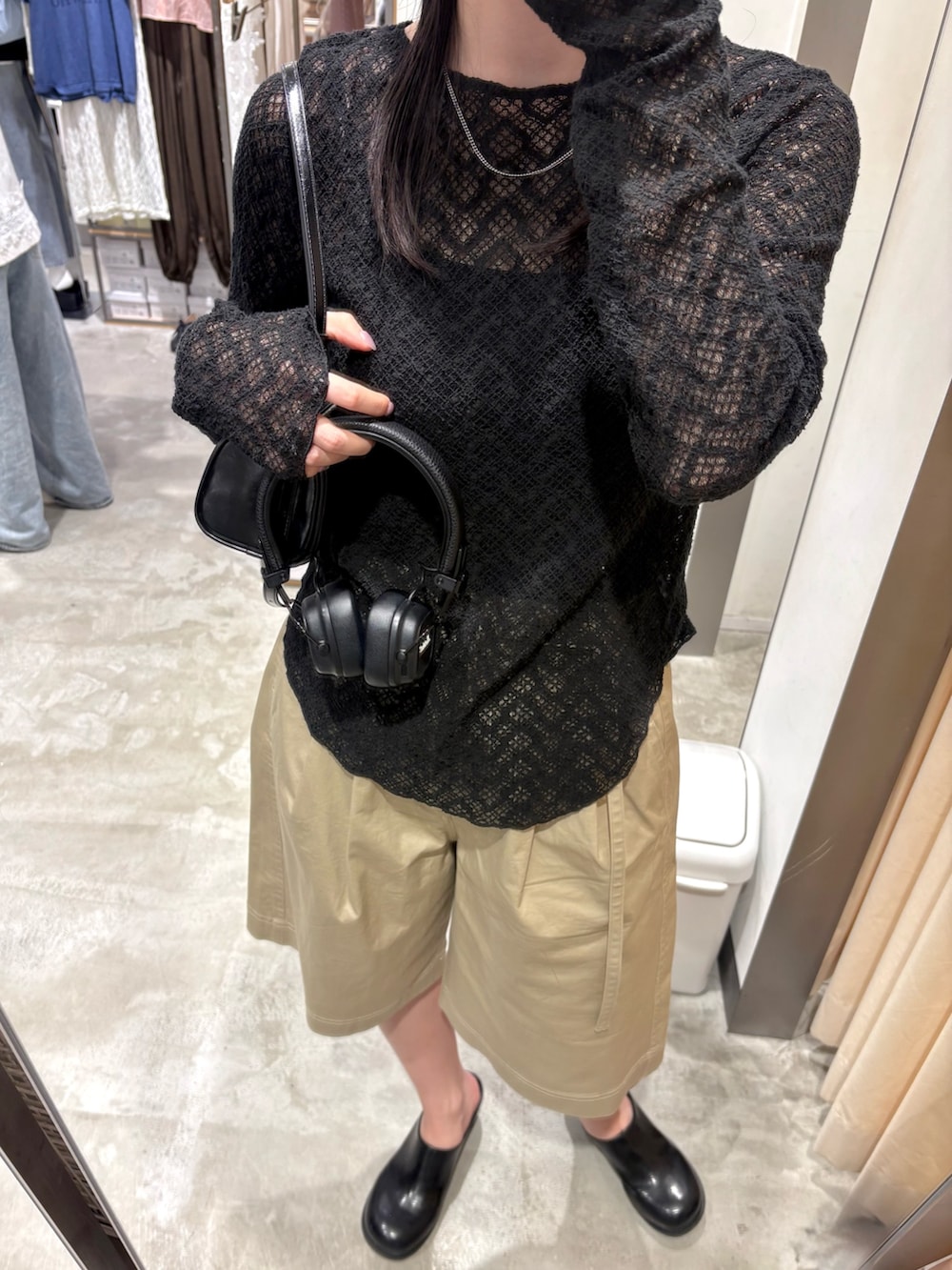 全身真っ黒はさすがに春らしさに欠けるので、レースのトップスで肌見せしつつ、ベージュのハーフパンツで軽さを出しました。