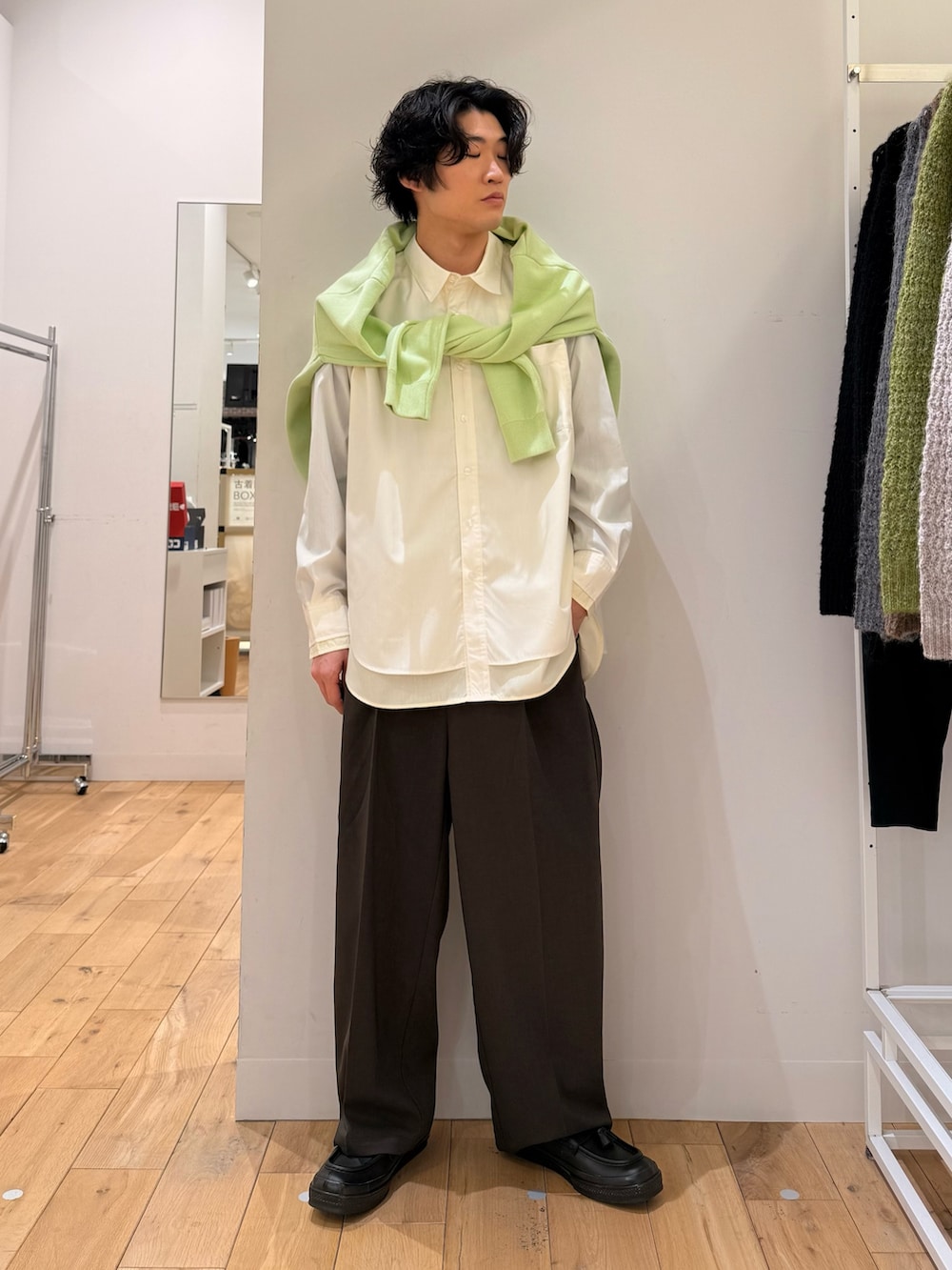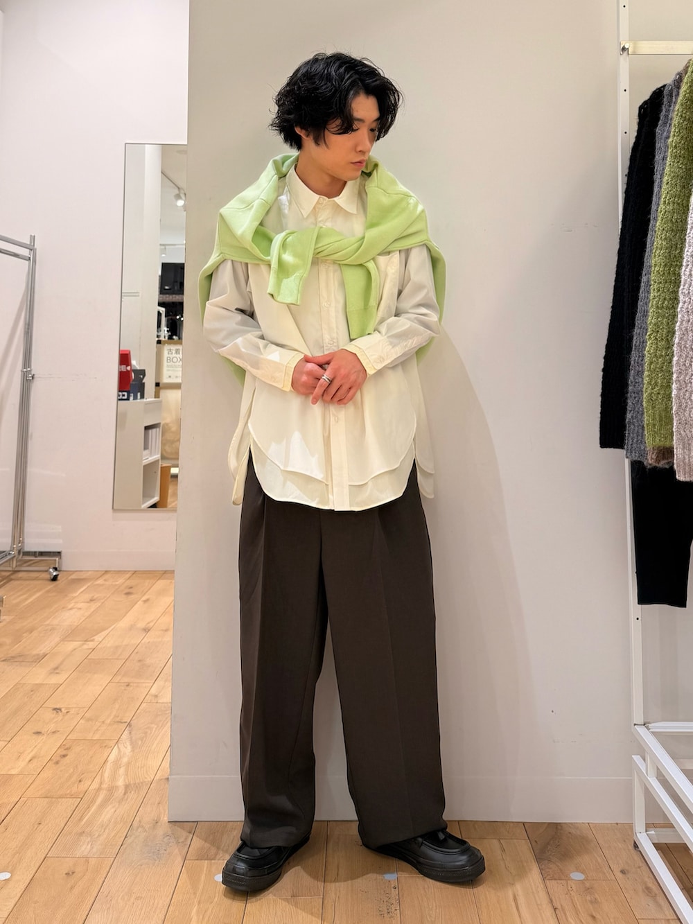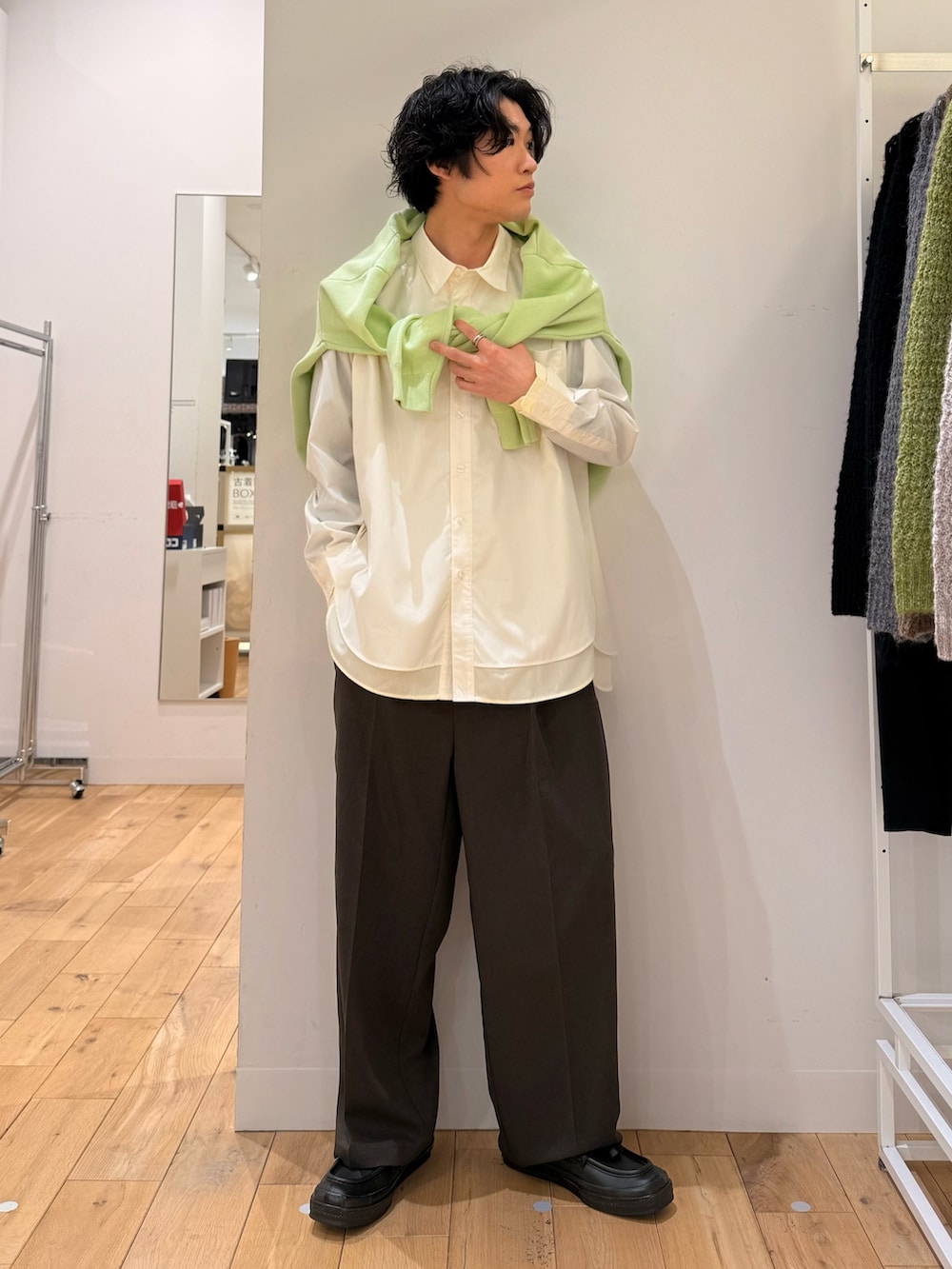 シャツは1枚でレイヤードしてくれるものなので、レイヤードの事を考えずに着れる楽なシャツです。