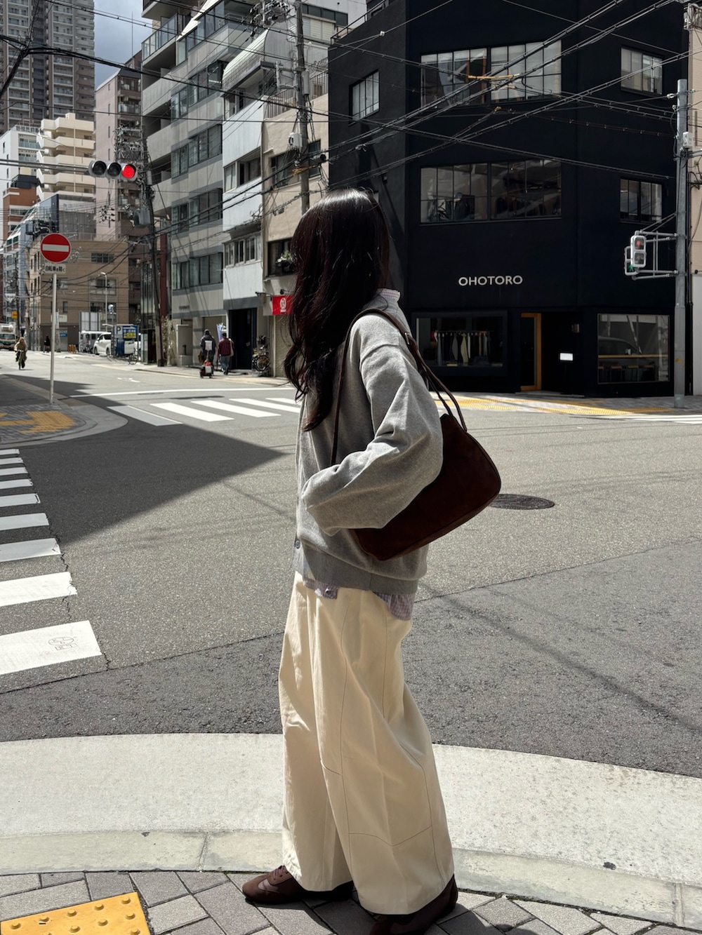 バッグとスニーカーのブラウンのスウェード生地リンクが統一感でておすすめです!