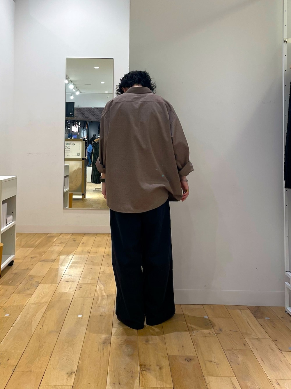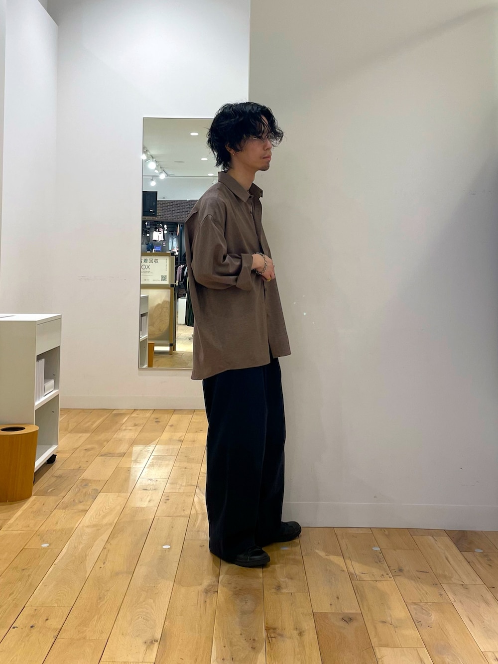 見る角度や光の当たり具合によって色味の変わる、面白い生地のシャツです。コットン生地のパンツと合わせてカジュアルに。