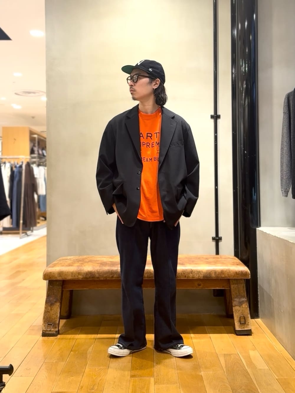 ブラックコーデにオレンジのTシャツで。