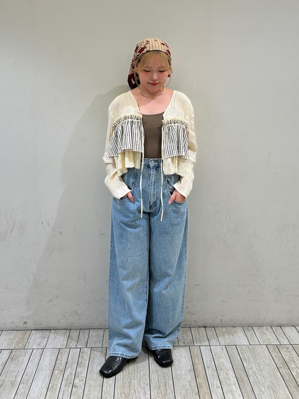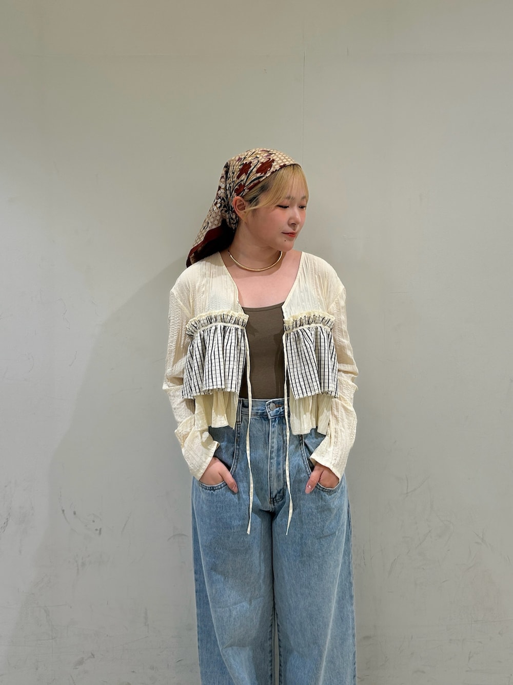 シンプルにデニムで合わせたので、カラーのインナーとスカーフを差し色でポイントになるようコーデを組みました!