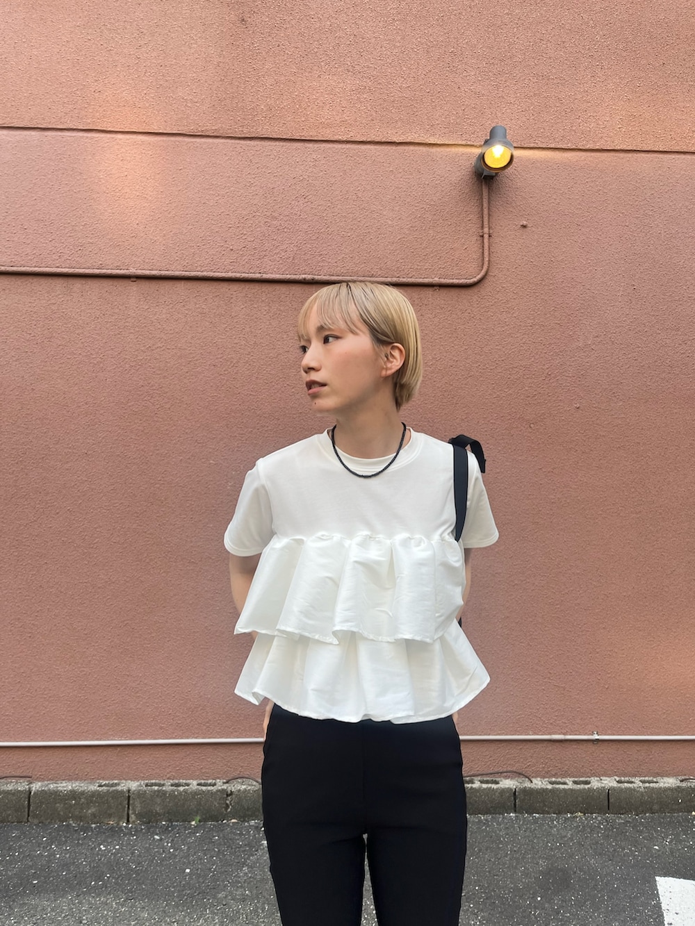 甘さ控えめのフリルトップスは、シンプルなアイテムとの相性抜群○