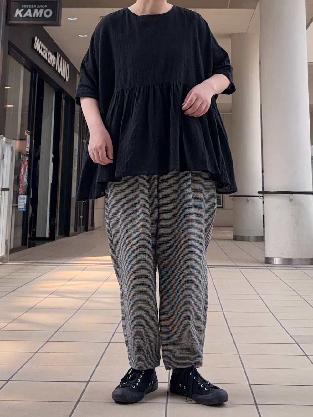 程よくギャザーが入っていて、身幅がたっぷりしているので、気になるところをカバーしてくれます。着回しやすい色合いで、簡単にスタイリングが完成する1着です◎