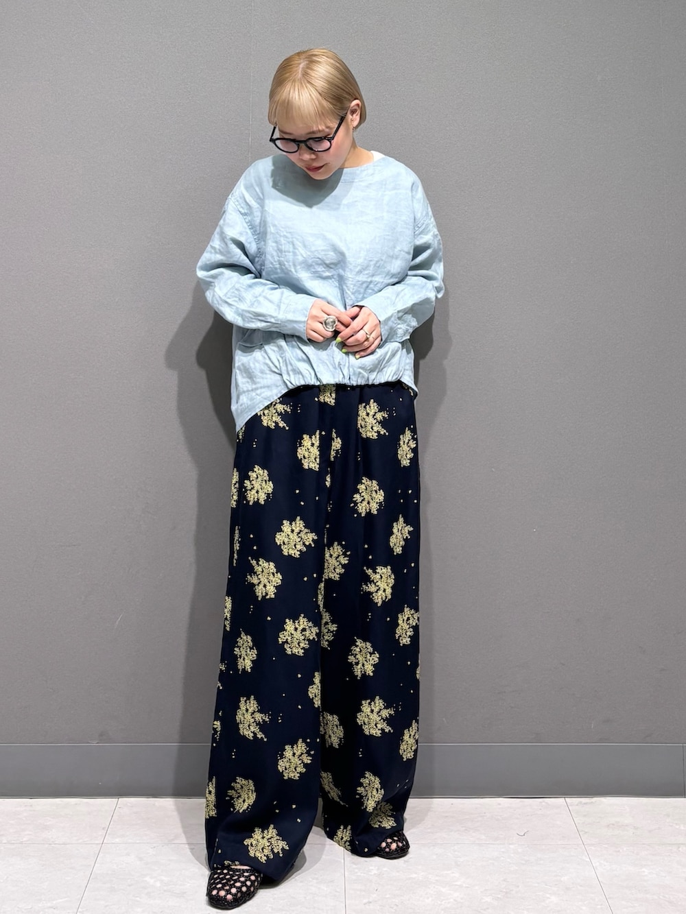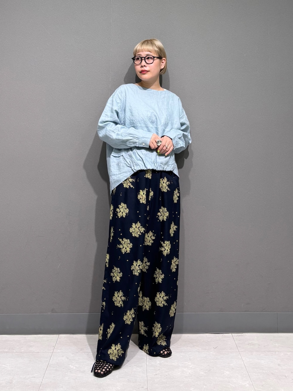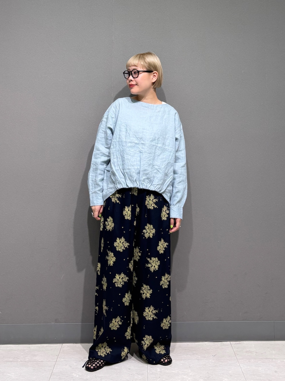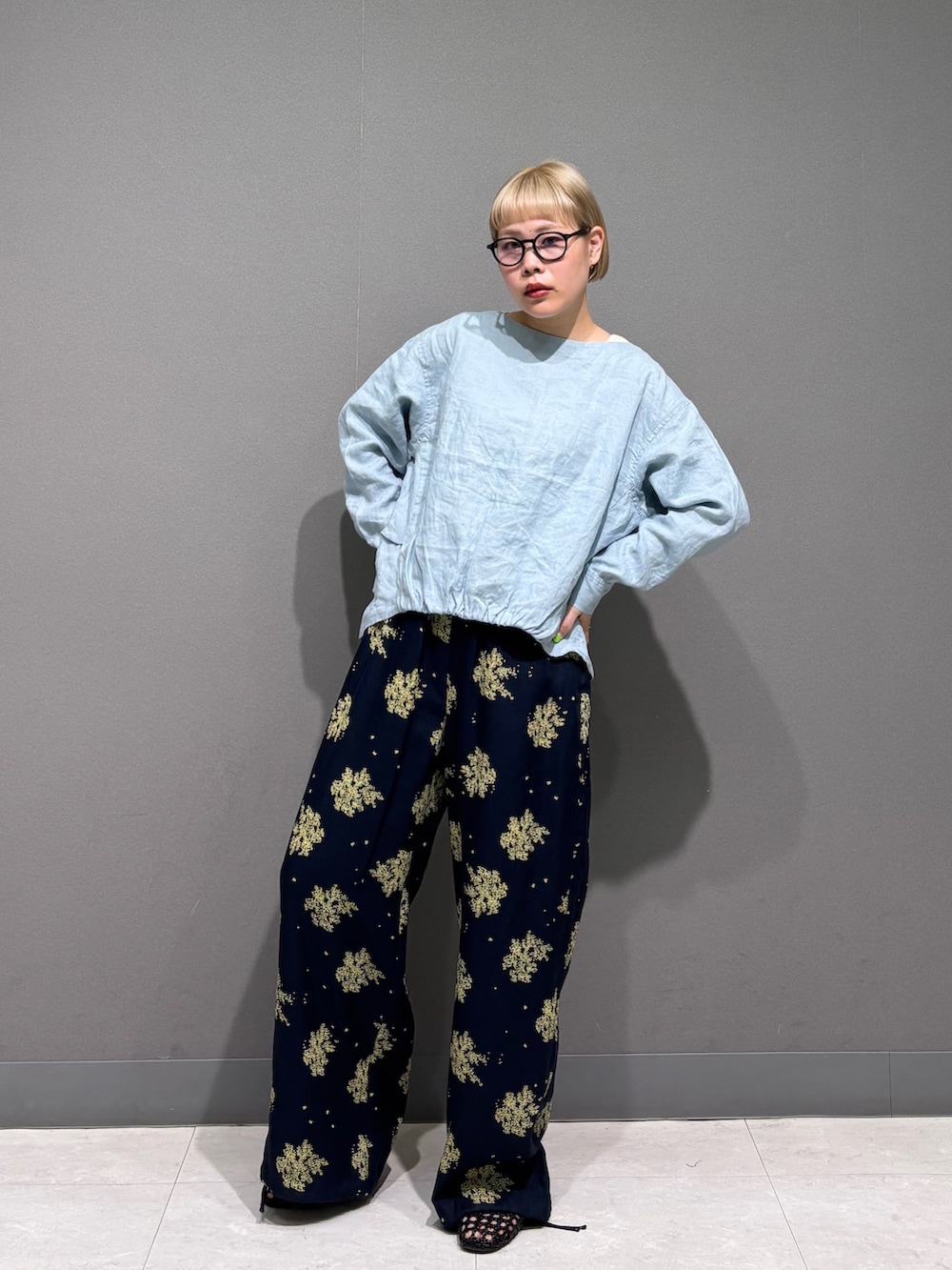 リネンのトップスに大胆な花柄パンツを。