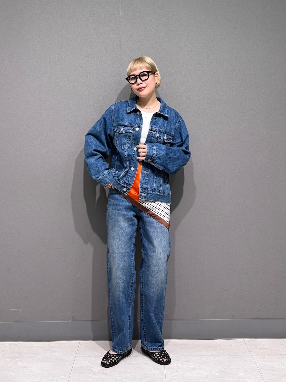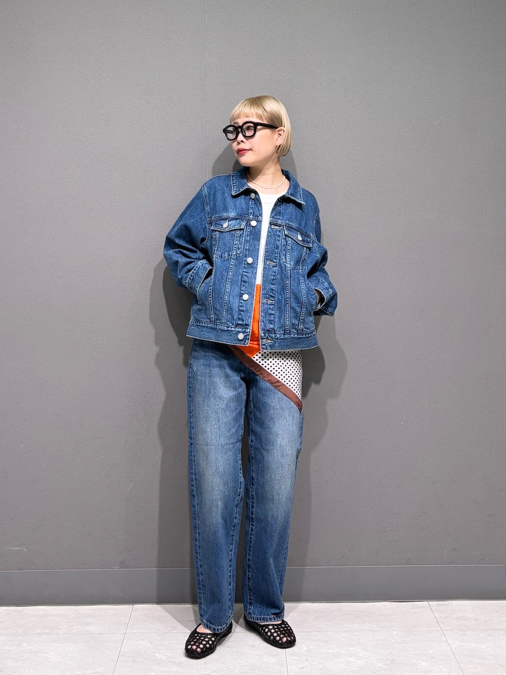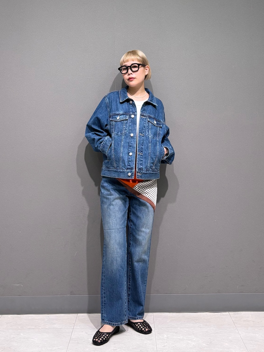 スカーフを腰巻きアレンジ。