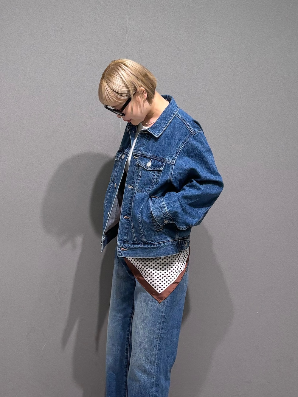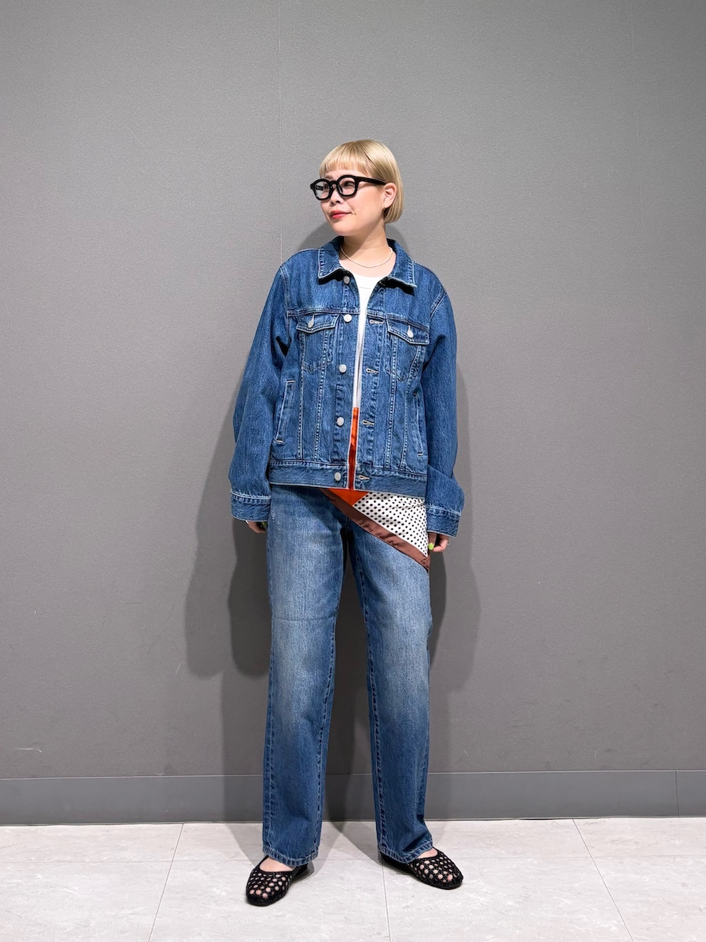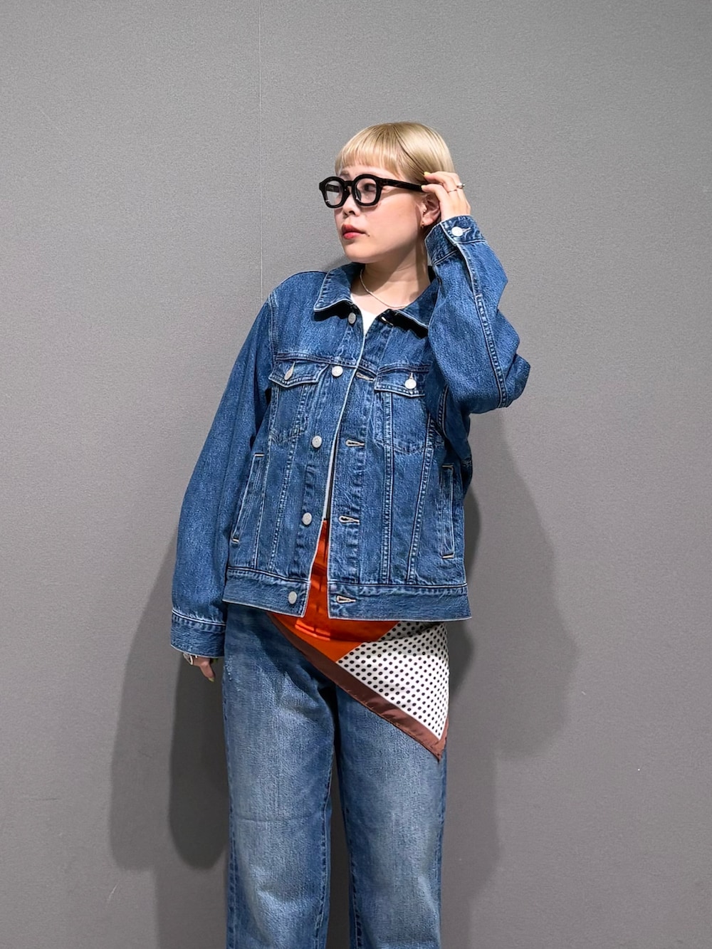 スカーフを腰巻きアレンジ。