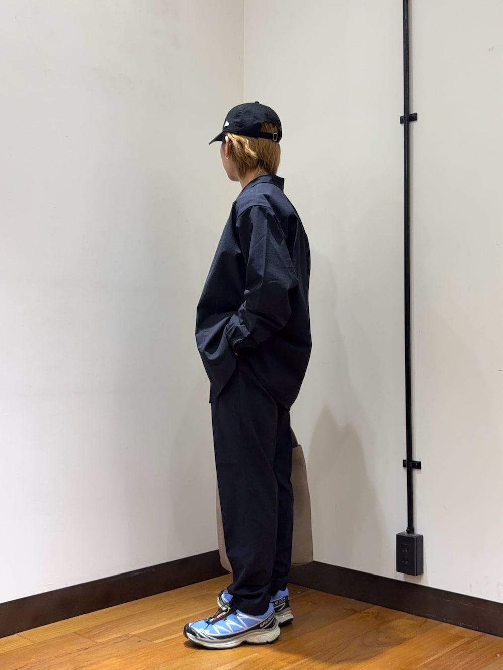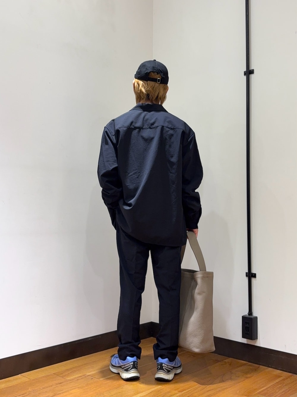 シャツなのにカバーオールなジャケットに、スッキリとしたテーパードなパンツで清潔感のあるコーデになります。さらにインナーをサックスブルーのバンドカラーシャツを合わせれば知的かつ、上品な印象になります。